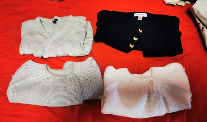 Lot de 4 gilets taille 1 mois en bon état. Peut comporter traces d'usures ou imperfections.
