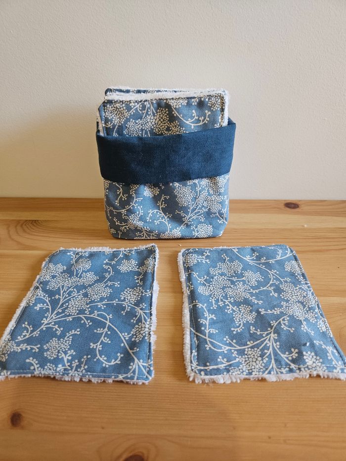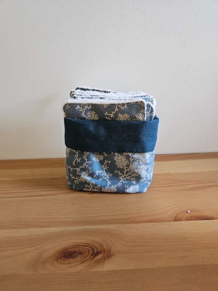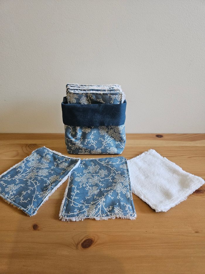 Lot de 10 lingettes lavables faites en coton et bambou bio pour une meilleure douceur et un respect de la peau. Les lingettes peuvent servir à nettoyer la peau, à démaquiller, à essuyer... L'ensemble des lingettes est accompagné de son panier assorti. Tout est fait main, ce qui rend la création unique 🌸 Une lingette mesure environ 9 cm sur 11cm. Plusieurs modèles sont disponibles, on peut en voir sur la dernière photo, n'hésitez pas à demander.