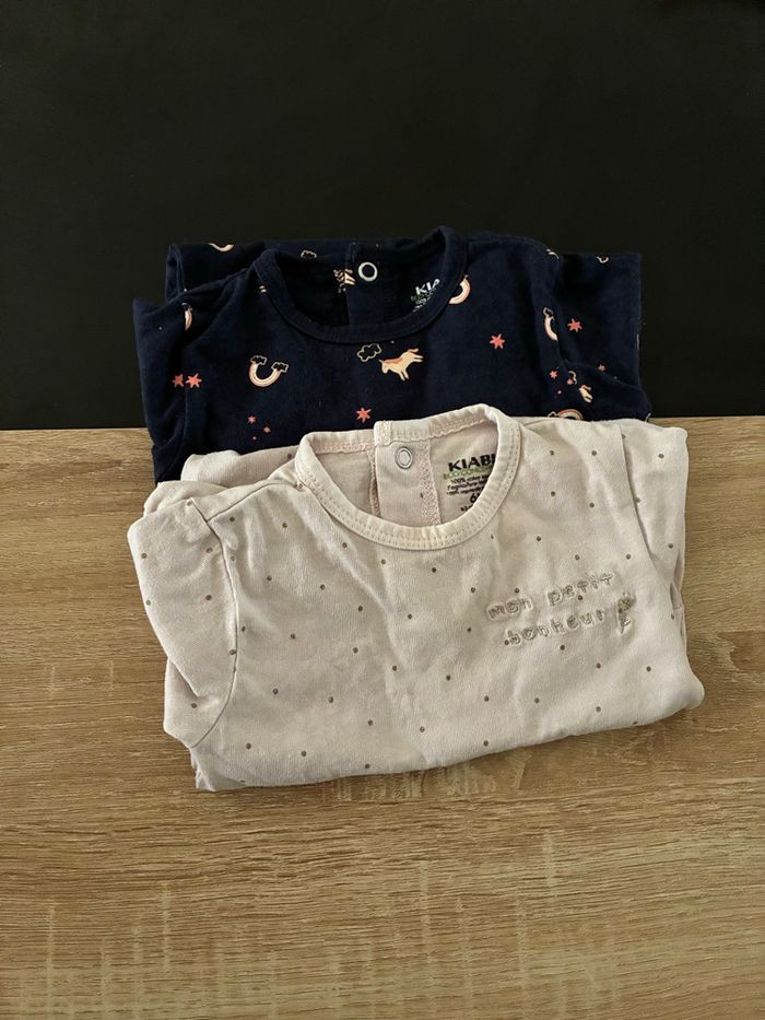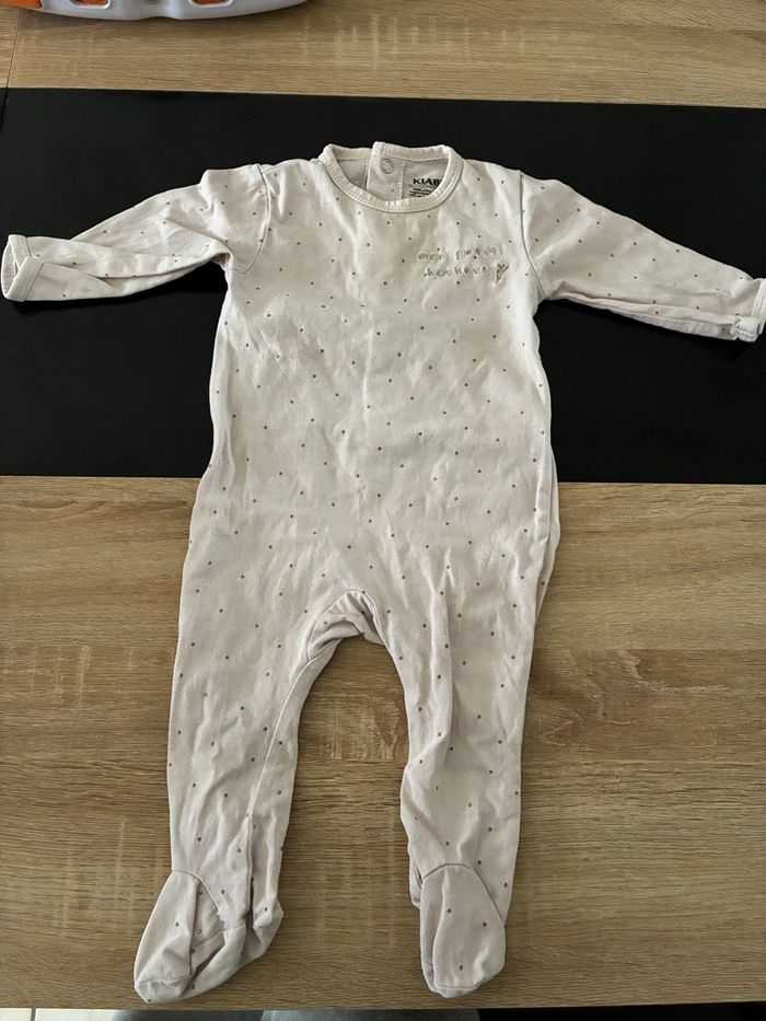 2 pyjamas avec pieds Kiabi. 6 mois, porté plusieurs fois Bon état.