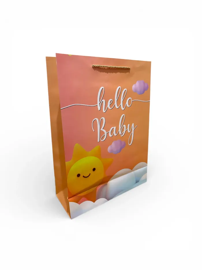 Sac cadeau anniversaire avec motif soleil orange et inscription « Bonjour bébé », parfait pour offrir un cadeau lors d’une fête ou d’une occasion spéciale. Design lumineux et coloré pour un effet joyeux et festif. Dimensions : 30 x 41,5 x 12 cm