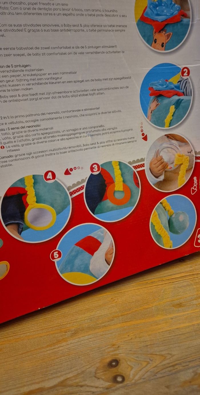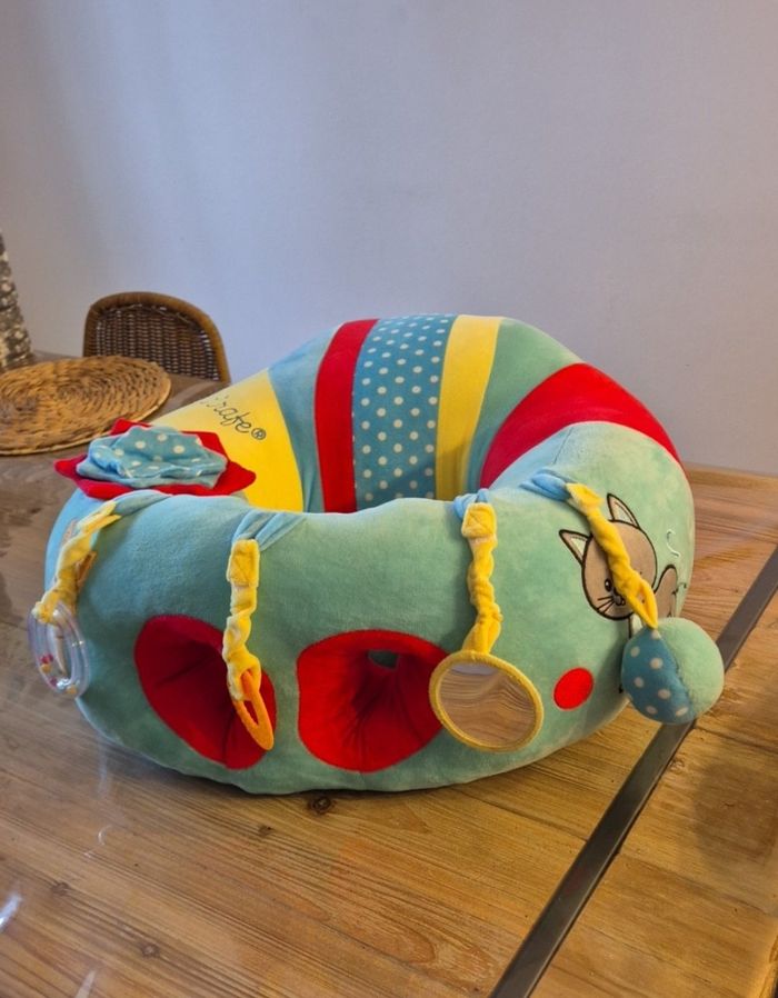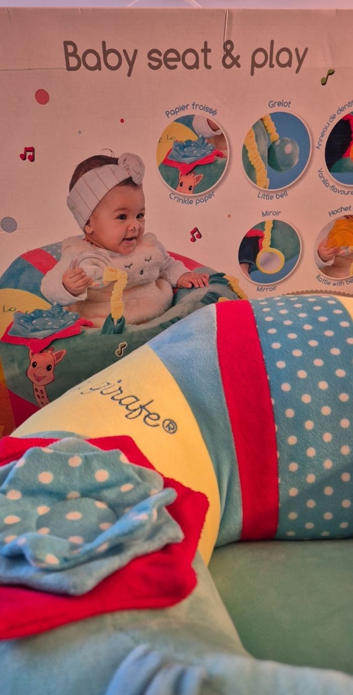 Un siège ultra confortable dans lequel bébé sera bien maintenu et pourra s'adonner à de joyeuses activités qui éveilleront ses 5 sens ! Bébé éveil ses sens grâce aux différentes activités : -Anneau de dentition -Miroir -Grelots -Papier froissé -Matières texturées (velours, satin,…) Avec ses activités détachables, le Baby Seat & Play offre à bébé de nombreuses combinaisons de jeu! ✔️ Très bon état ✔️ Très peu servi ✔️ Maison non-fumeur ✔️ Propre, sans taches