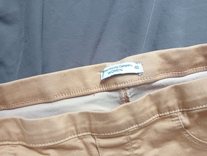 ✨ Pantalon jegging stretch taille 40. Marque " Fashion private compagny " 💫 Très agréable à porter , taille élastique juste à enfiler, contient 3% d'Elasthanne.  💫 2 poches à l'arrière  🌸 couleur beige avec des reflets un peu " or " en parfait état très peu porté.  ➡️ Vous trouverez quelques mesures en photos. La mesure à taille indiquée est sans étirer la taille .
