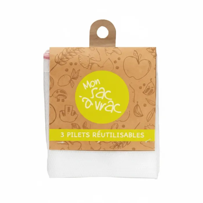 Lot de 3 filets réutilisables Mon Sac en Vrac, fabriqués à partir de matière recyclée, recyclables et éco-responsables. Chaque filet est équipé d’un cordon de serrage et d’un emplacement pour étiquette imprimée par la balance. La maille robuste résiste jusqu’à 5 kg, parfaite pour transporter fruits, légumes et autres courses légères. Dimensions : 25x30 cm, 30x33 cm, 30x40 cm.