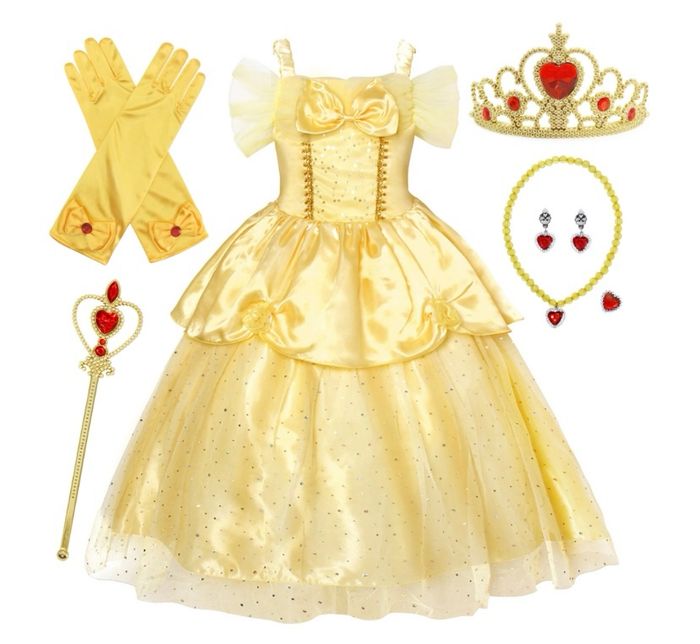 Déguisement robe de princesse dorée et ces accessoires (couronne, baguette, gants, bijoux). 1 taille disponible : - 5-6ans : longueur de la robe 90cm, Vendu dans leur pochette d’emballage d’origine, idéal pour faire un cadeau ! Expédition rapide après votre commande.