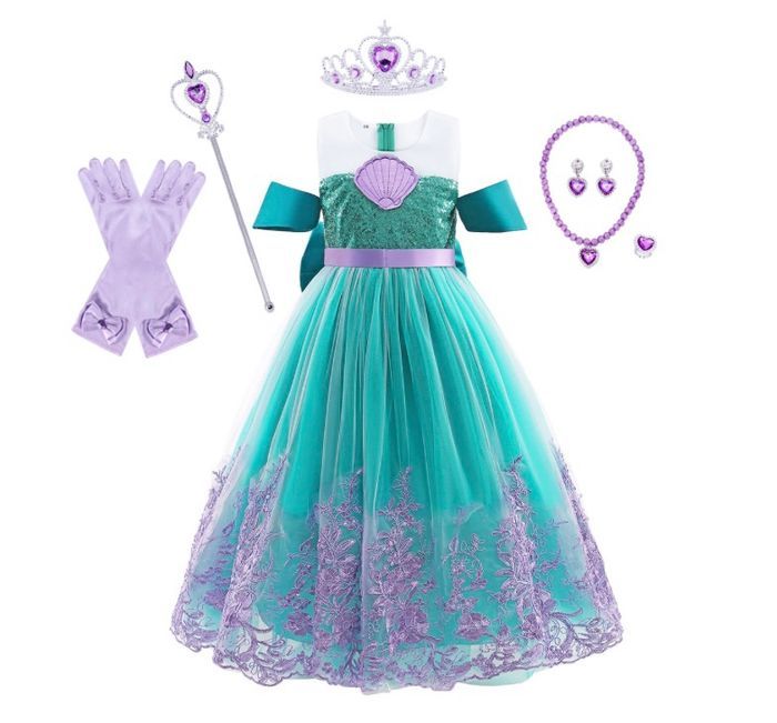 Déguisement robe sirène coquillage et ces accessoires (couronne, baguette, bijoux, gant). 1 taille disponible : - 4-5ans : longueur de la robe 80cm, Vendu dans leur pochette d’emballage d’origine, idéal pour faire un cadeau ! Expédition rapide après votre commande.