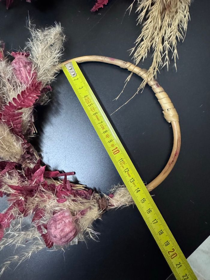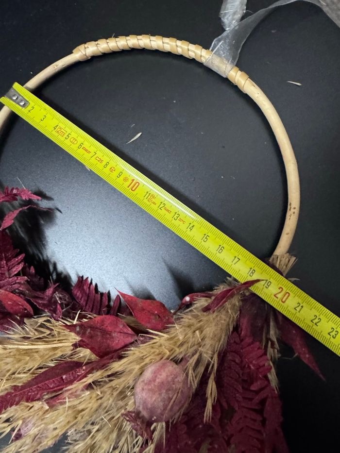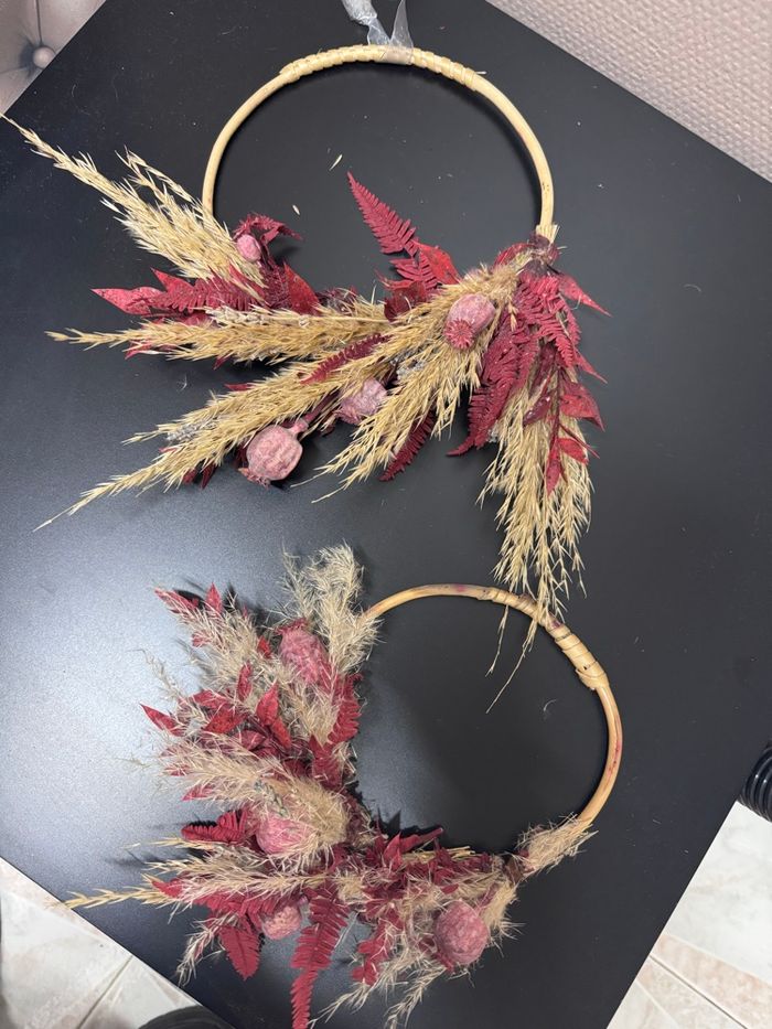 Je vends ces magnifiques cercles mural décoratif composé de fleurs séchées et d'épis de blé dans un style bohème et ethnique. - Type de produit : cercle mural décoratif - Style : Bohème / Ethnique - Matière : Bois - Couleur : Bordeaux - Décoration : Fleurs séchées et épis de blé 2 cercles, 2 tailles un de 15cm de diamètre et de 19cm Très bon état N'hésitez pas à me contacter pour plus d'informations