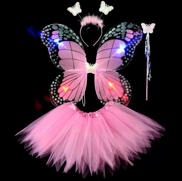 Deguisement papillon rose clair à LED composé de 4 pièces ; une jupette, les ailes de papillon (élastique à enfiler), une baguette et un serre tête. Jupe tutu élastique. Taille unique, convient aux petites filles de 3-6ans. Vendu dans leur pochette d’emballage d’origine, idéal pour faire un cadeau ! Expédition rapide après votre commande.