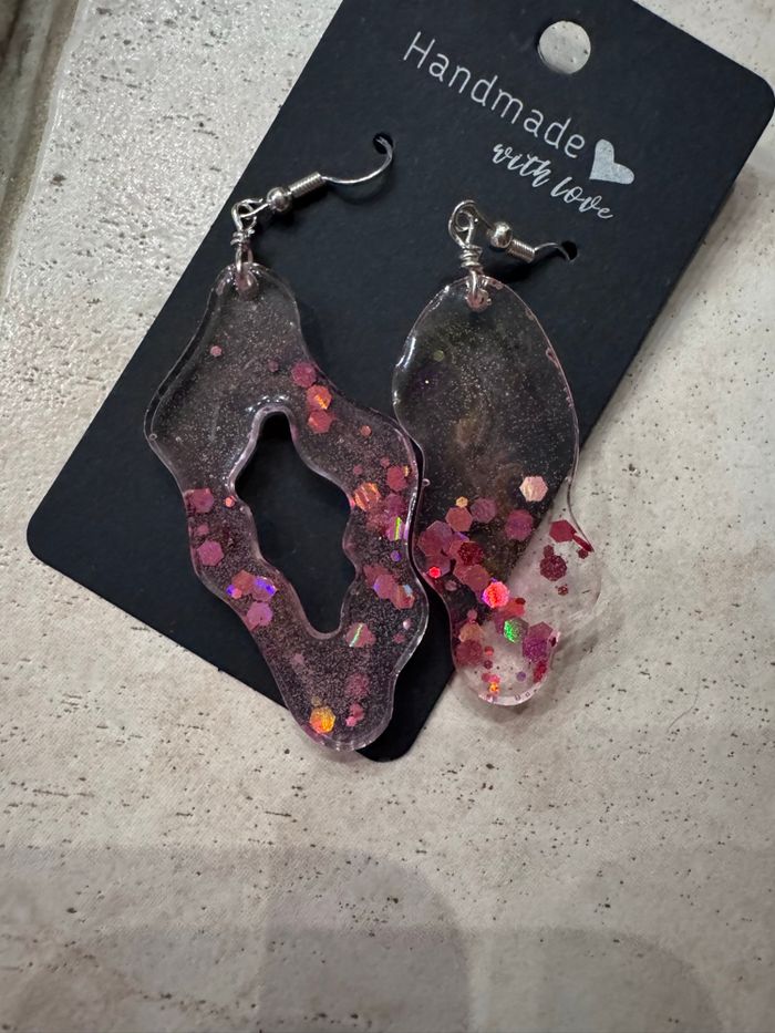 Je vends ces boucles d'oreilles fantaisie fabriqué main. - Type de produit : Boucles d'oreilles - Univers : Femme - Marque : Nature Bijoux - Matière : Résine transparente avec inclusions colorées État neuf. N'hésitez pas à me contacter pour plus d'informations !