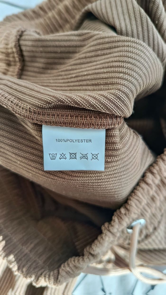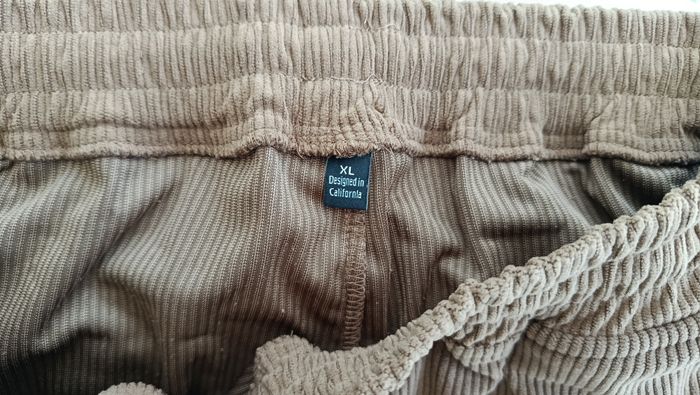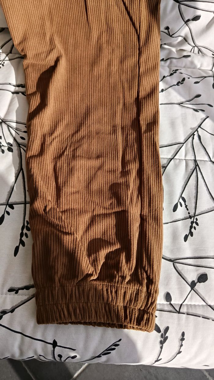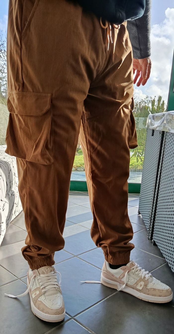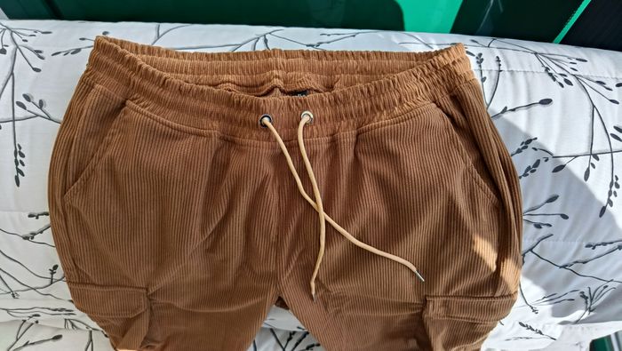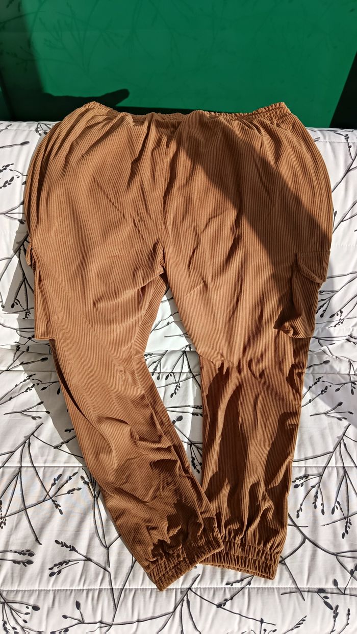 Pantalon en velours côtelé. Marron, style cargo. Taille XL. Cordon de serrage, bas resserré. Poches sur les côtés. Mesures: taille: 44 cm, longueur totale: 105 cm. Jamais porté.