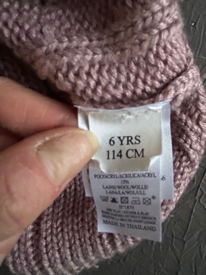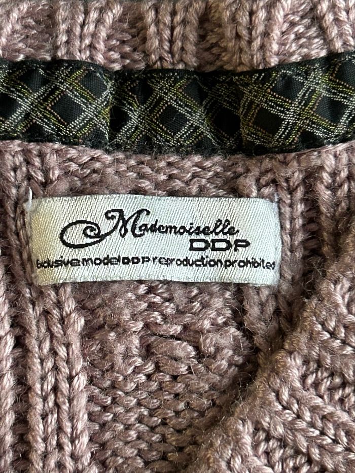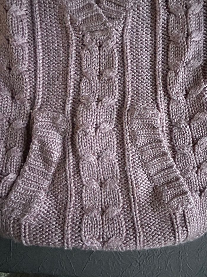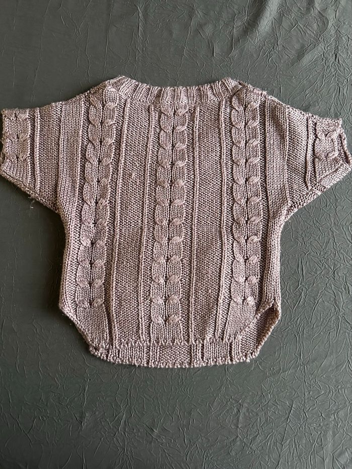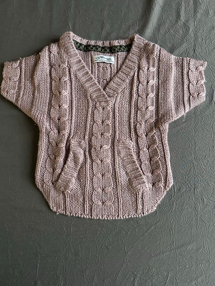 pull/débardeur en tricot pour fille de la marque Ddp, de couleur lilas. Taille 6 ans. Manches courtes style débardeur. Poche kangourou devant. Bas du pull en forme arrondi. Matière tricot à torsades, doux (ne gratte pas). En très bon état.