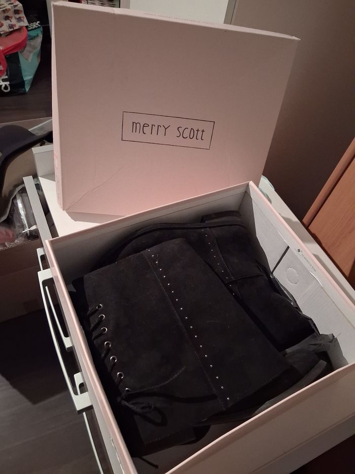 Jolies bottes noires à laçage sur l'arrière, fermetures éclairs sur l'intérieur en très bon état, matière effet daim, taille 38 Vendu dans leur boîte d'origine N'hésitez pas à me contacter si vous avez des questions 😀