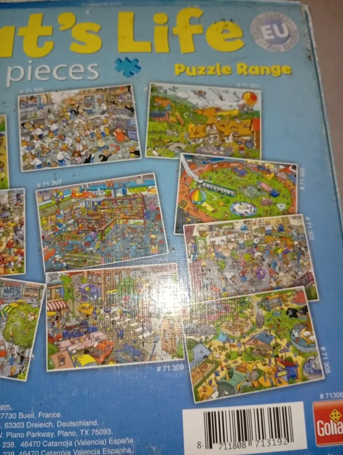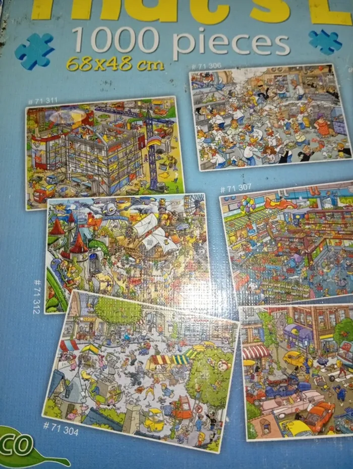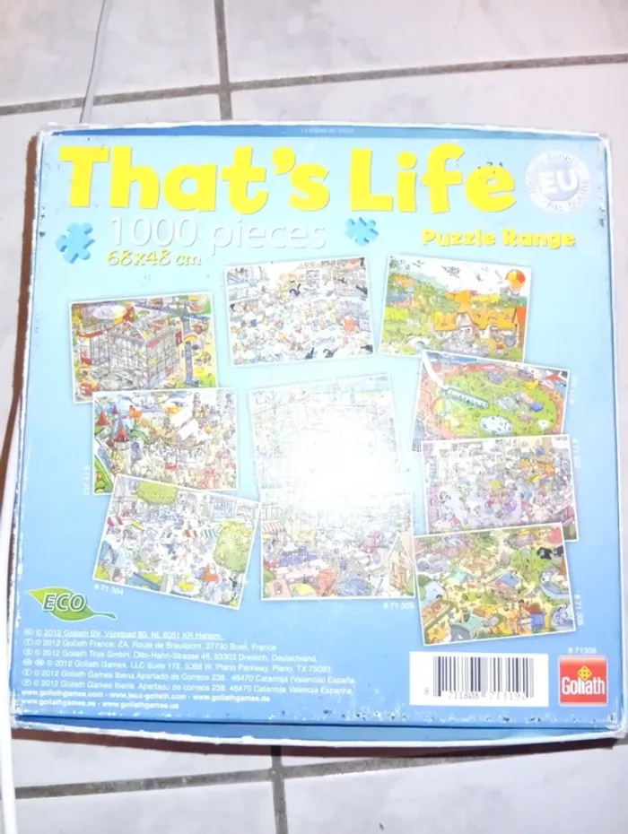Une collection de puzzles reprenant des scènes de la vie quotidienne au travers d'illustrations détaillées et loufoques Premium Qualité Puzzle 1000 Pièces, avec différents motifs Dimensions du puzzle assemblé : 68 x 48 cm Age minimum : 7 ans Dimensions : 19.8x19.8x7.5 cm Manque 3 pièces ( la 4eme a été retrouvée)