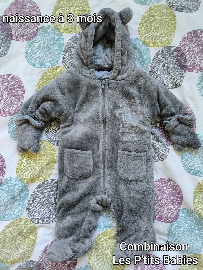 Combinaison bien chaude pour l'hiver Avec des moufles intégrées qui peuvent être retirées à l'aide de boutons pression mais tiennent avec des ficelles pour ne pas être perdu. Capuche avec petites oreilles. Ouverture par fermeture à l'avant Taille : Naissance à 3 mois (taille grand) En très bon état