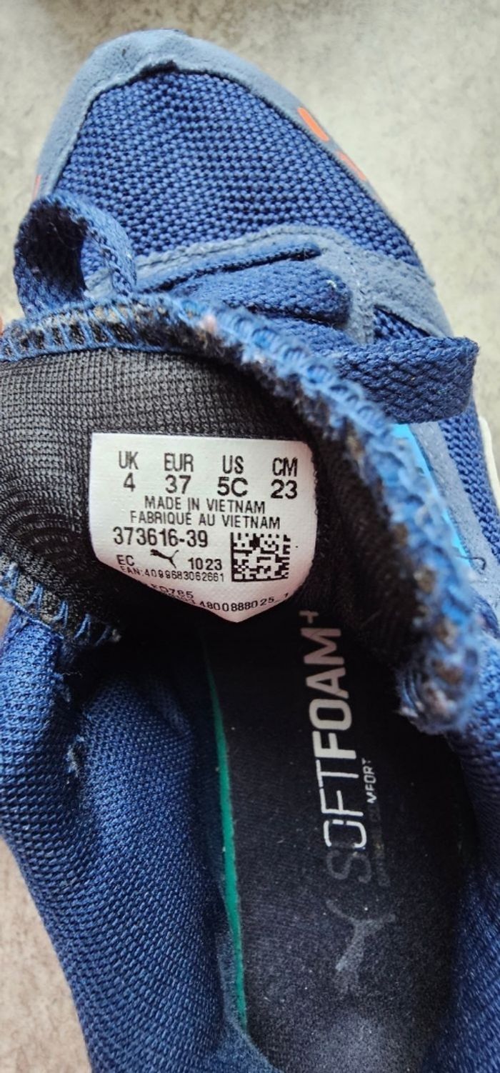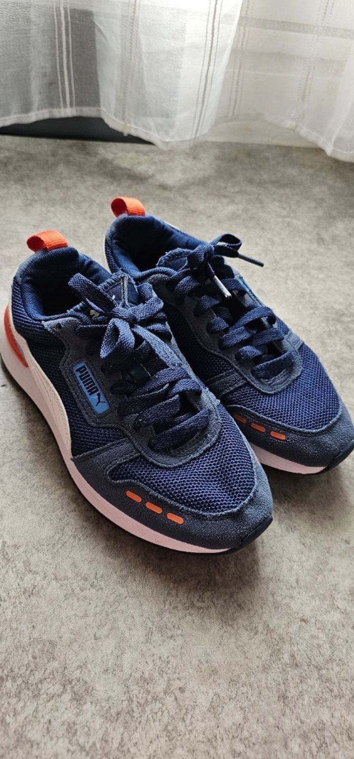 Baskets Puma pour enfant en bon état, Couleur : bleu marine avec détails orange et blanc. Confortables, légères et parfaites pour l’école ou les sorties. Taille : 37. Propres et prêtes à porter 👟 💌 Envoi rapide et soigné. #puma #basketsengarçon #basketsenfant #chaussuresenfant #taille37 #école #sport