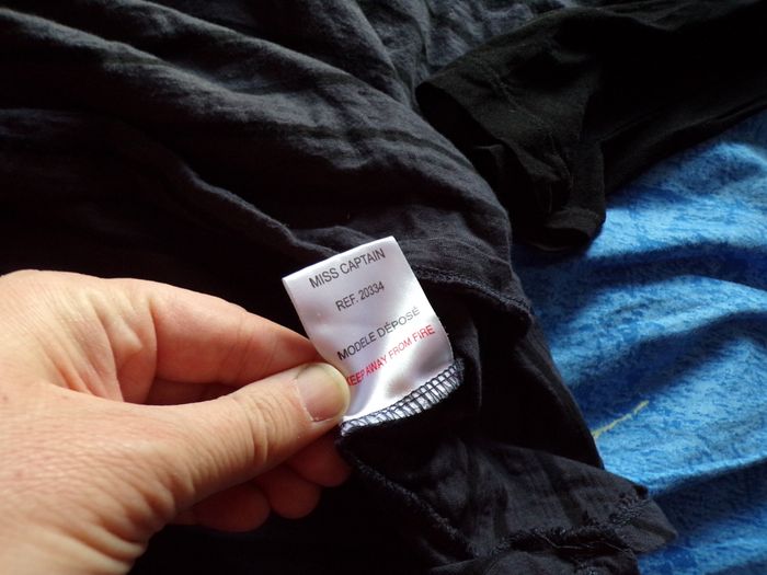 Tee-shirt noir et gris rayé. Marque Miss Captain, taille 4, convient idéalement pour un 42/44. Très bon état.