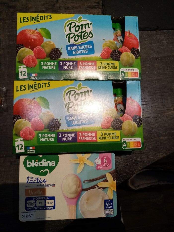Compotes dlc 14/12/26 et crèmes vanille 05/04/26. Prix non négociable car déjà très bas