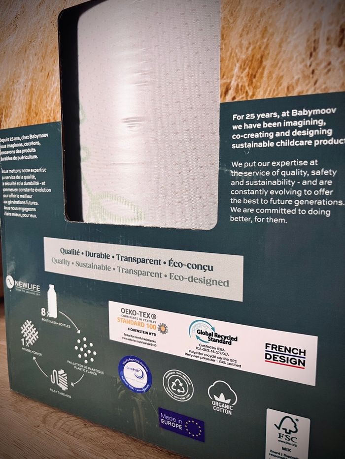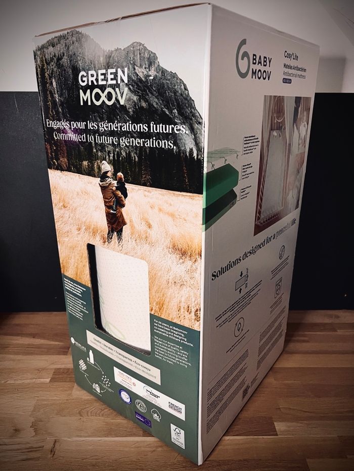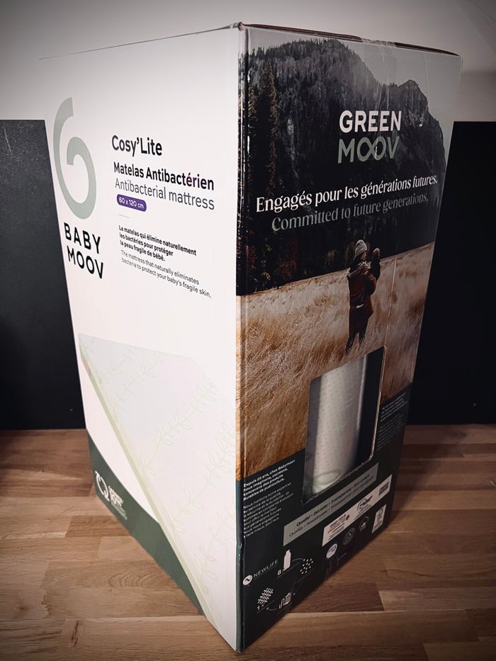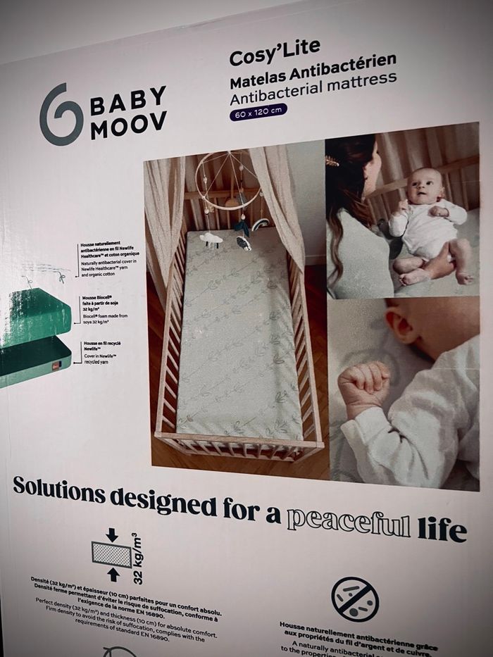 Matelas pour lit bébé BabyMoov Cosy’Lite, conçu pour offrir confort, hygiène et sécurité dès la naissance. 🍼 Marque : BabyMoov 🍼 Modèle : Cosy’Lite 🍼 Dimensions : 60 x 120 cm (standard lit bébé) 🍼 État : neuf, jamais utilisé, jamais déballé Prix neuf : 150€ Possible de trouver à 100€ en période de promotion. ✔ Caractéristiques principales : • Matelas antibactérien naturel (fils d’argent et de cuivre dans la housse) • Mousse Biocell® à base de soja (plus écologique) • Densité ferme : 32 kg/m³ • Épaisseur : 10 cm (confort + sécurité) • Conforme à la norme EN 16890 (anti-suffocation) • Housse lavable en machine à 30°C 👉 Convient pour un usage quotidien, hygiénique et confortable pour bébé. 📦 Produit neuf, jamais sorti de son emballage d’origine.