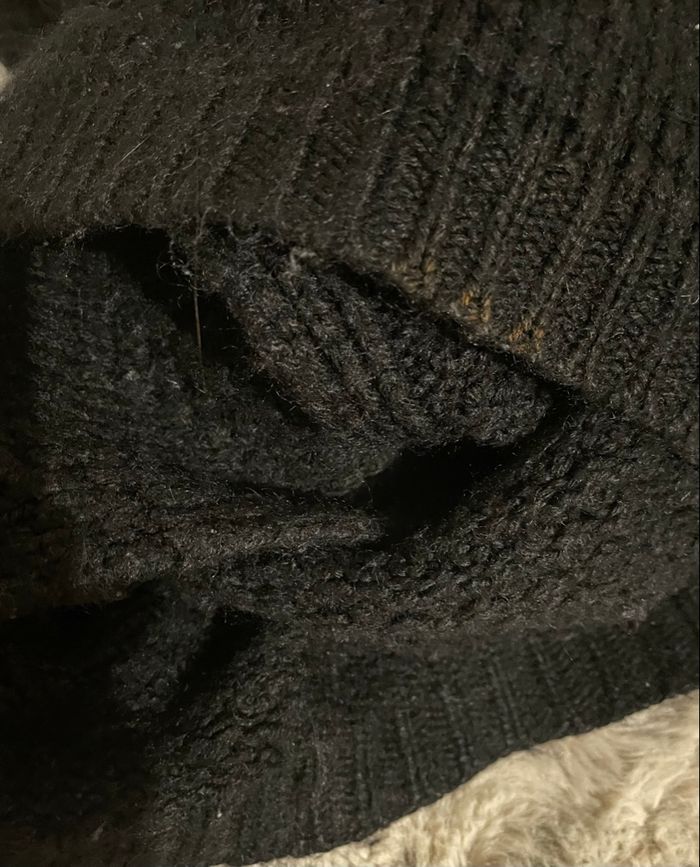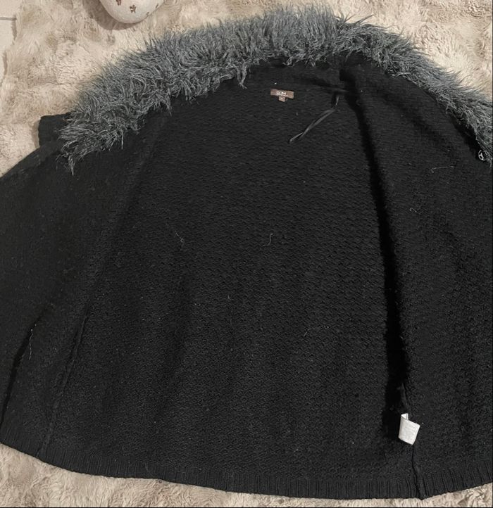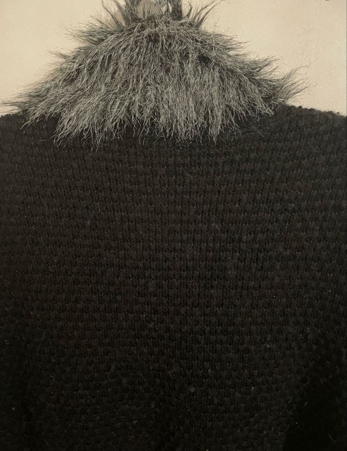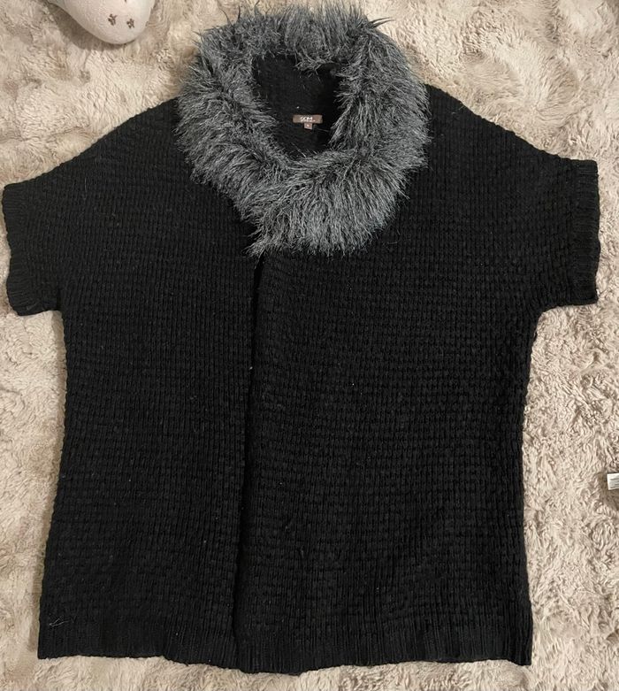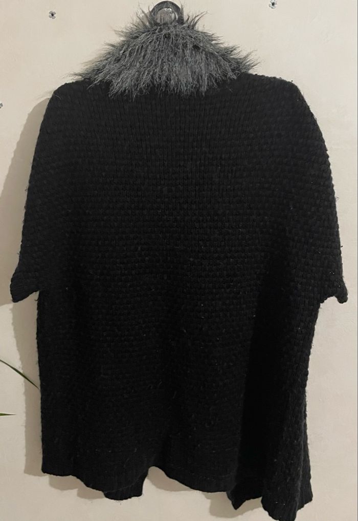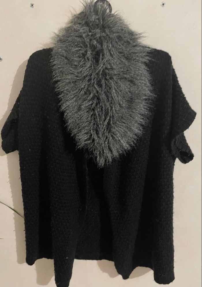 Poncho Gilet femme taille S taille large couleur noir Manches courtes fausse fourrure gilet tricot grosse maille c’est petit défaut il se ne voit pas voir dernière photo Bas de gilet porté bon état Dimensions à plat longueur 79 cm