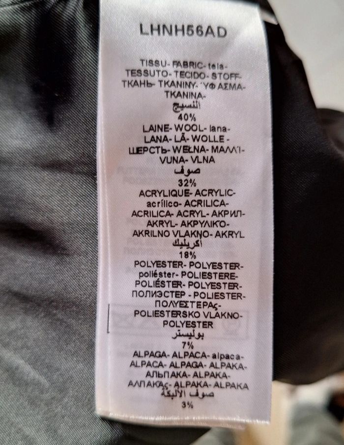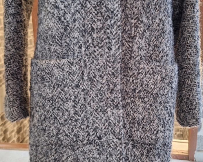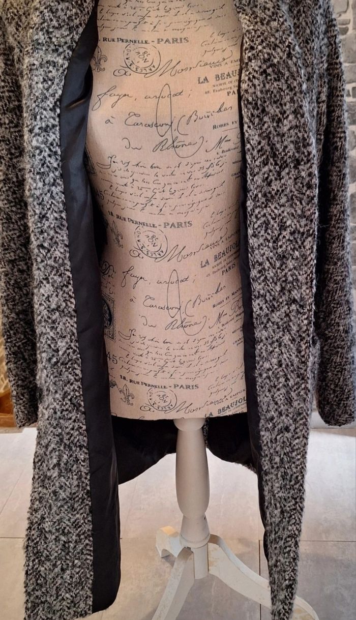 Manteau doublé de longueur 88 cm en laine, acrilyque, polyester et alpaga. Deux grandes poches. Fente derrière. Passants pour adapter une ceinture. Fermeture par 3 boutons pression.