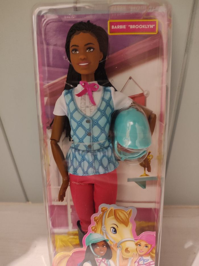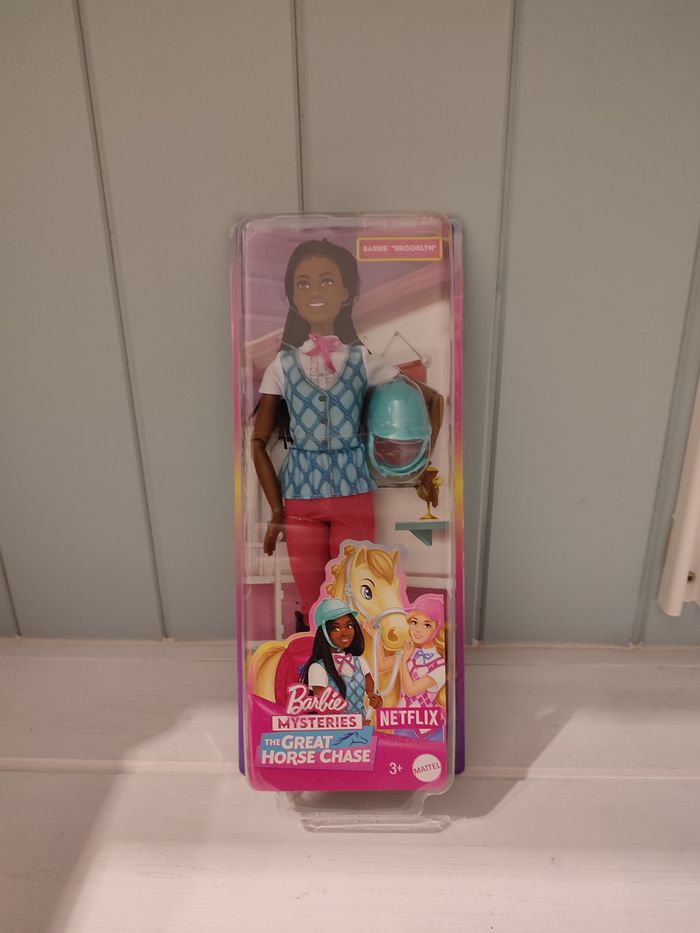 Inspiré de la série Netflix Barbie Mysteries : The Great Horse Chase, la poupée Barbie « Brooklyn » est prête à s’élancer au galop hors de l’écran et à s’amuser ! Elle est prête à partir à l’aventure à cheval avec son gilet bleu argyle, un pantalon, des bottes et une bombe amovibles !​ La poupée est articulée au niveau des coudes, des poignets et des genoux pour des aventures réalistes !
