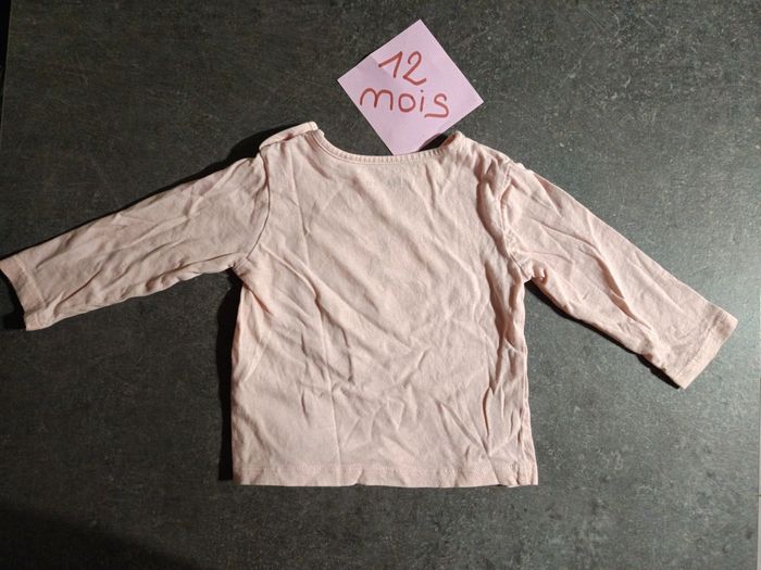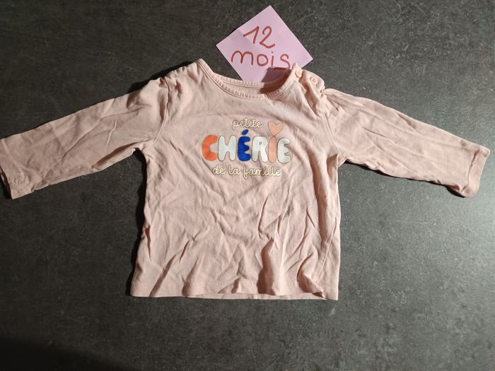 T-shirt manches longues, rose avec inscription "petite chérie de la famille" avec paillettes NEUF jamais porté ! Taille 12 mois
