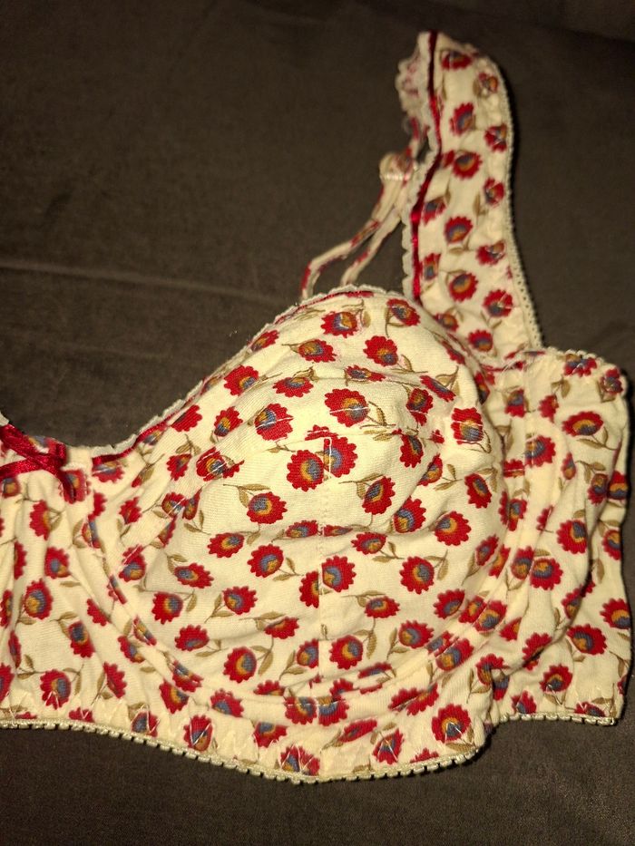 ​Je vends ce charmant soutien-gorge de la marque Valège, modèle "Marilyn". Il arbore un style rétro très frais avec son imprimé à petites fleurs rouges sur fond crème. ​Marque : Valège. ​Taille : 90B (France) / 75B (Europe). ​Matière : 100% Coton, idéal pour le confort au quotidien et les peaux sensibles. ​Détails : Petit nœud rouge satiné à l'entre-bonnet, bordures en dentelle fine, bretelles réglables avec liseré contrastant. ​Maintien : Modèle à armatures assurant une jolie silhouette. ​État : Très bon état général. Le système de fermeture à agrafes est impeccable.