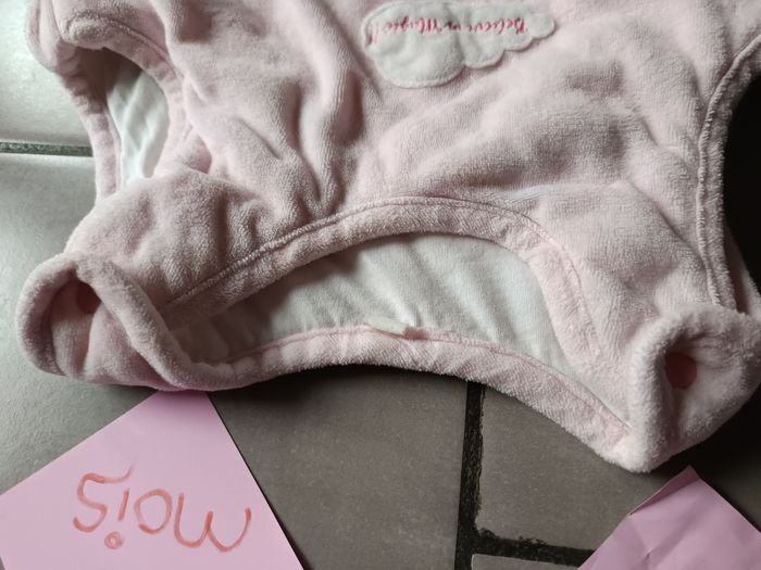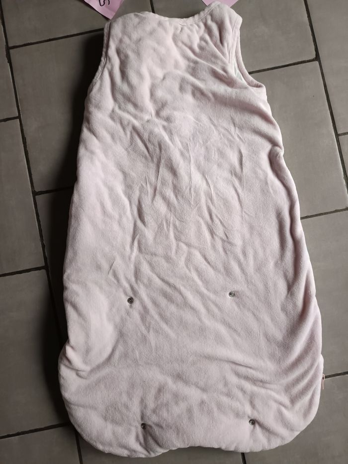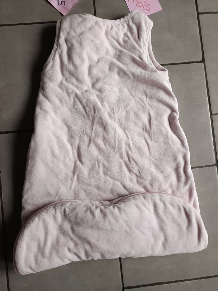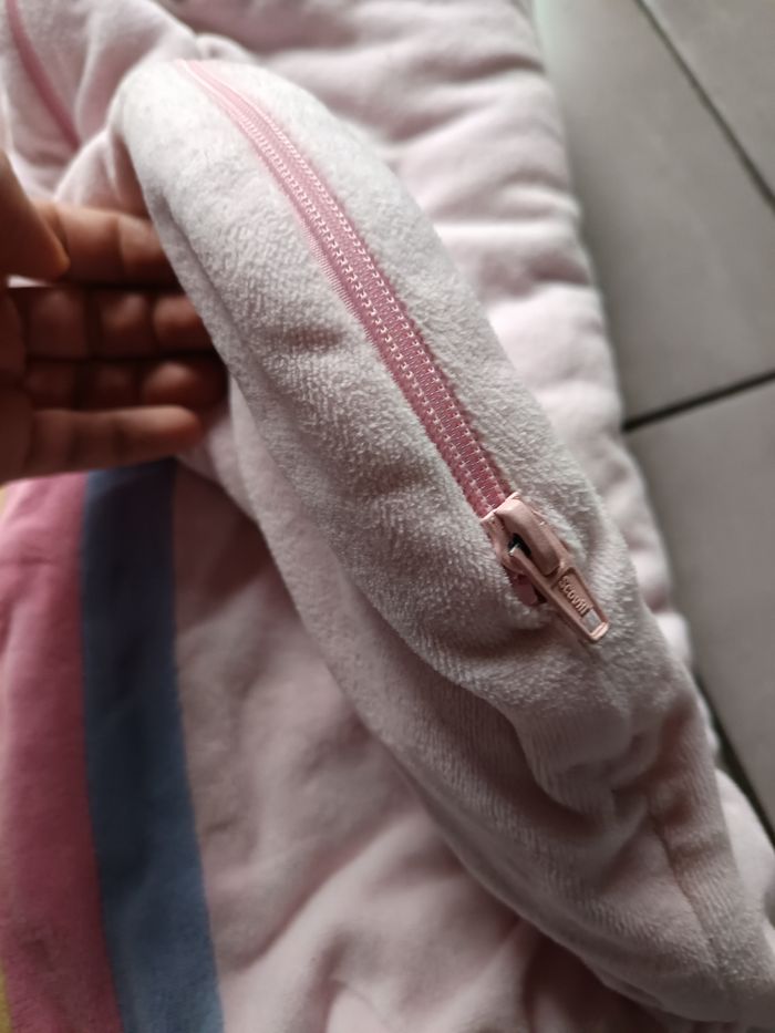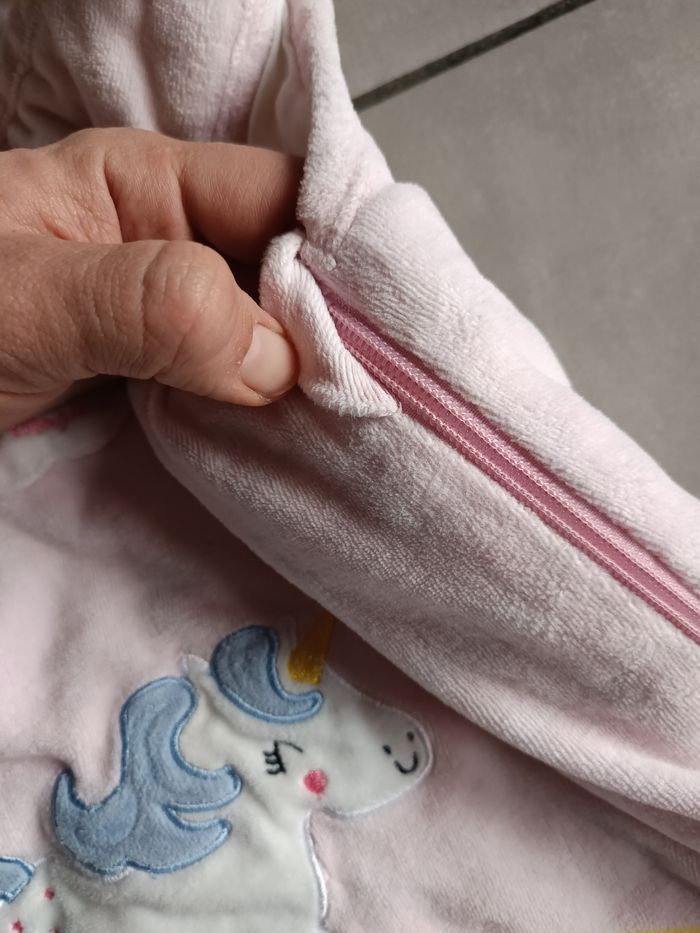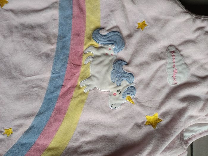 Gigoteuse en velours rose avec motif licorne 🦄 et arc en ciel 🌈 Ouverture par pressions au niveau des épaules et fermeture éclair sur le côté Taille de 6 à 36 mois Tog 2 ou 3 (ideale pour l'hiver) Très bon état