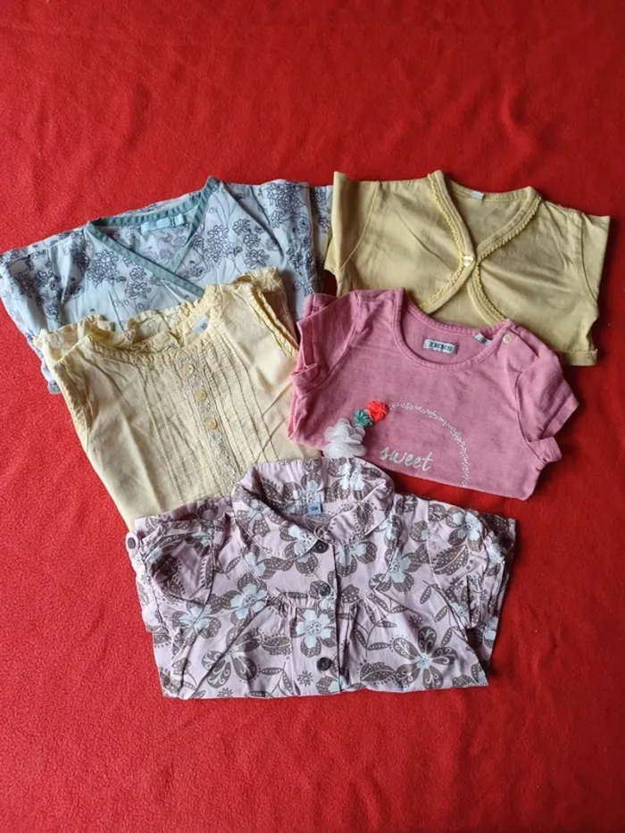 🩷 1 blouse cache coeur légère 🩷 1 gilet court 🩷 1 débardeur 🩷 1 t-shirt 🩷 1 blouse Très bon état, pas de tâches, ni de trous Marques variées : Ikks, obaïbi