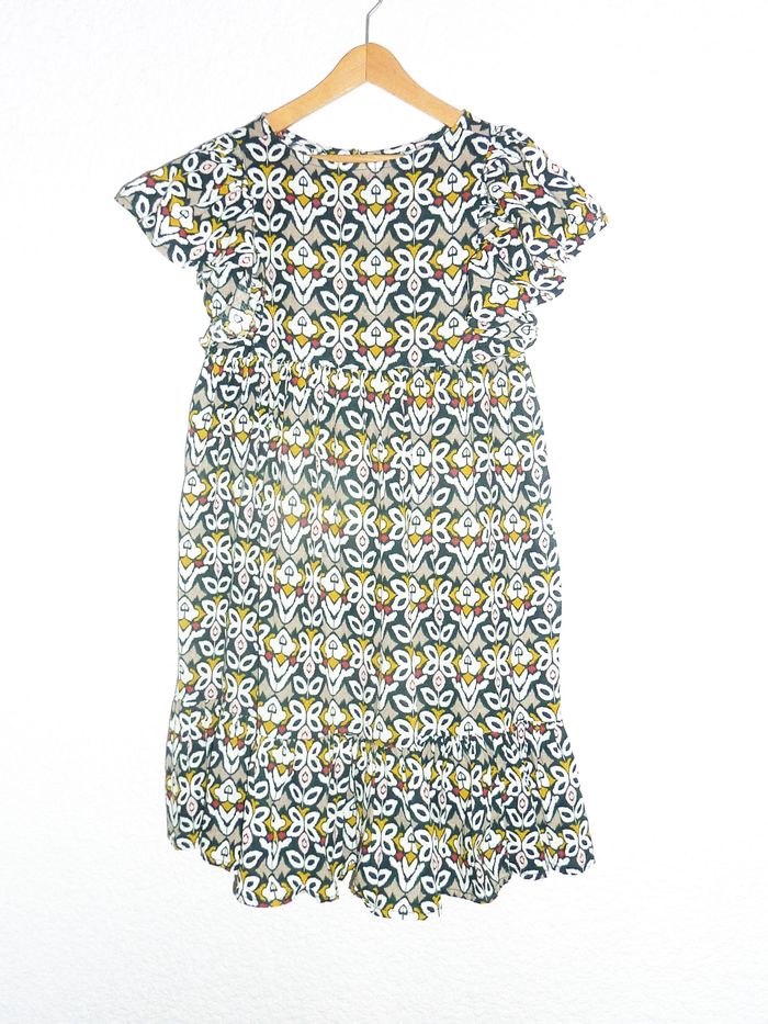Robe en état excellent de marque TAO, volantée, imprimé couleur vert et moutarde.