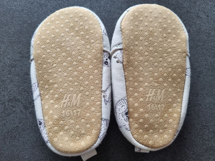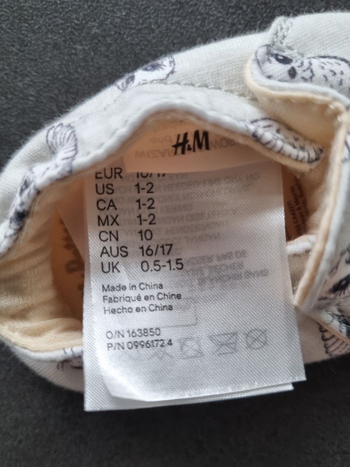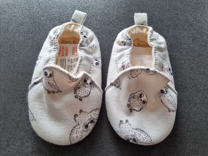 Chaussons Harry Potter (motifs chouettes) écrus, H&M, 16/17 (équivalent 0/6 mois) Neufs