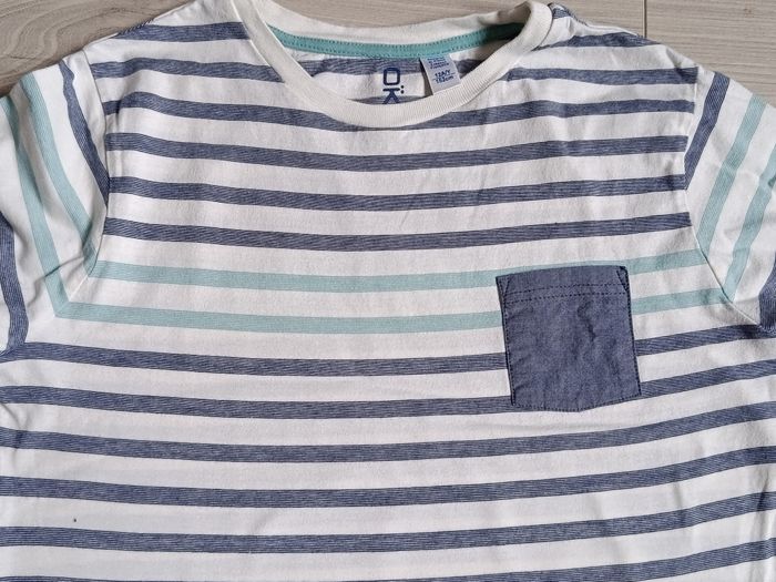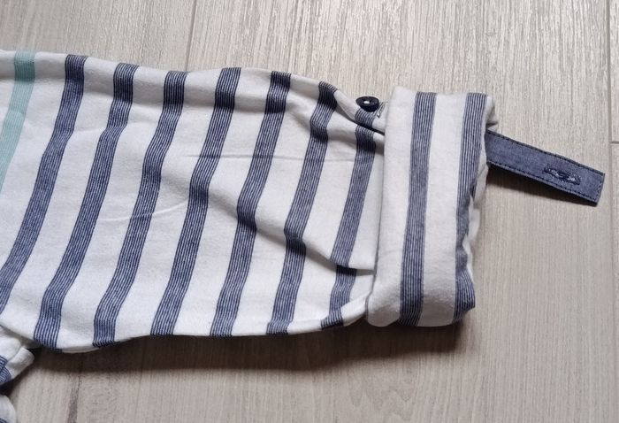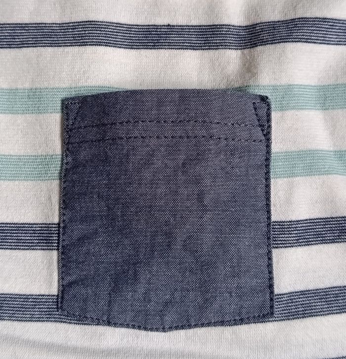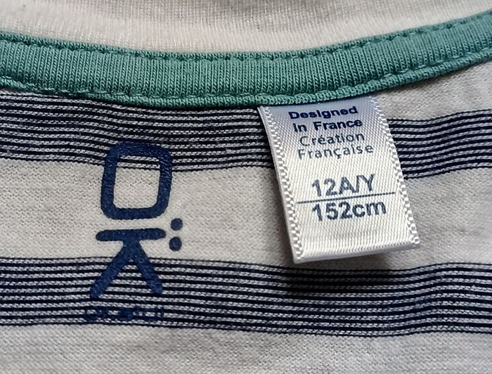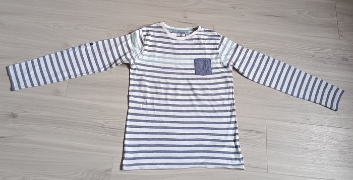 Tee-shirt à manches longues, rayé dans les tons bleu marine et bleu turquoise, sur fond blanc. Encolure ronde. Une toute petite poche dans le haut, sur le devant. Possibilité de remonter les manches. Marque Okaïdi. Taille 12 ans (152 cm). Très peu porté. En très bon état (est comme neuf)