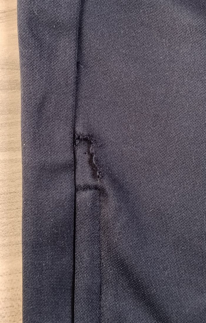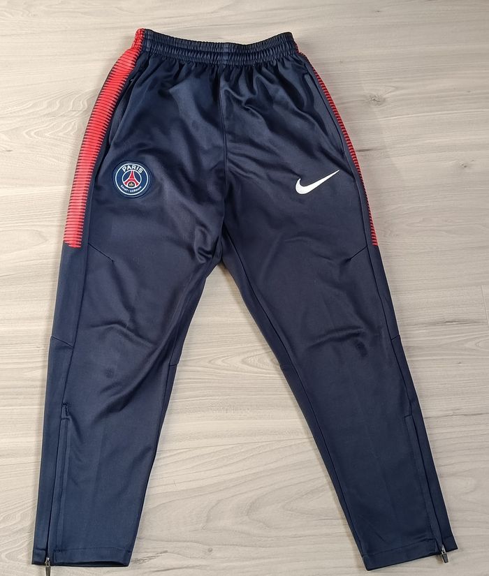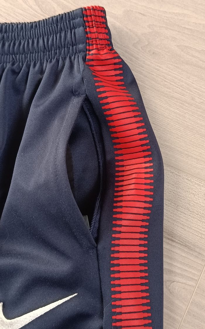 Bas de survêtement du PSG de couleur bleu marine. Taille très élastiquée et réglable à l'aide d'un cordon. Bande rouge sur les côtés extérieurs, au niveau des cuisses. 2 poches plates, obliques et zippées sur le devant. Petite ouverture possible dans le bas du pantalon à l'aide de fermetures éclairs. Marque Nike. Taille 12 ans. Peu porté. En très bon état malgré la présence d'un tout petit accroc au niveau d'une jambe (juste au-dessus de la fermeture éclair : cf avant dernière photo), et d'un genou un petit peu râpé : cf dernière photo qui a été grossie +++. Ces 2 signes d'usure ne se voient pas tant que ça. Haut du survêtement du PSG vendu à part dans mon dressing