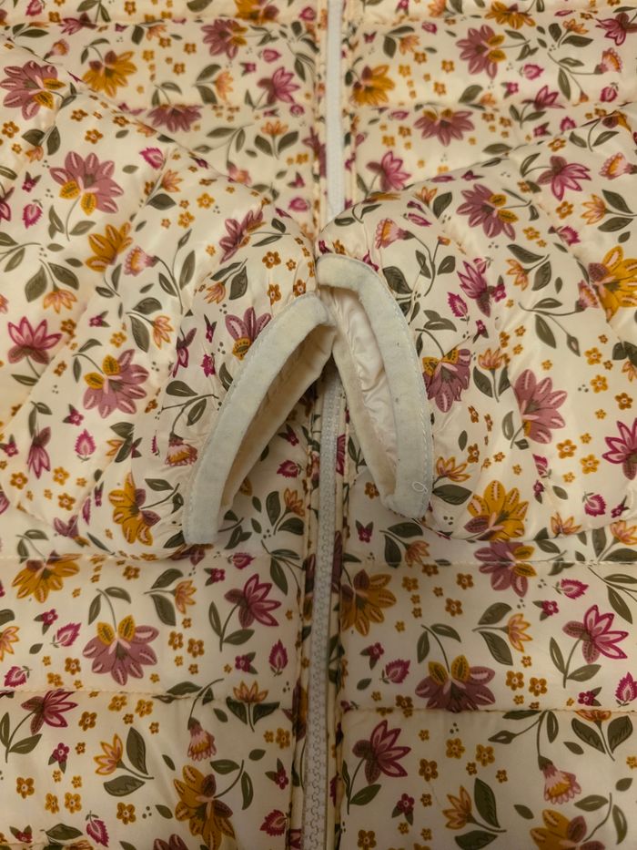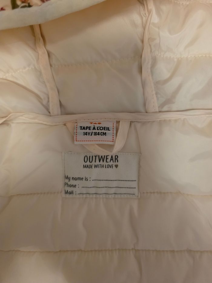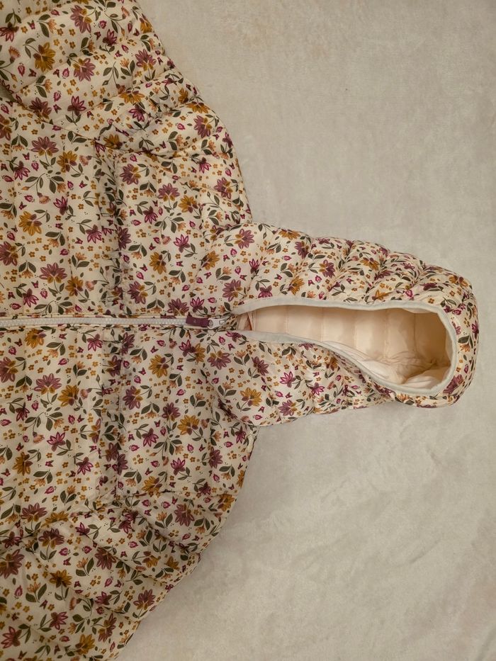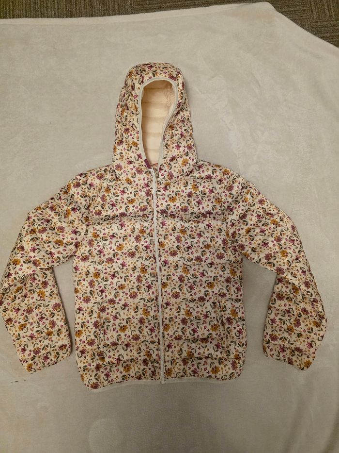 Très Jolie doudoune légère avec motif floral de la marque Tape à l'œil. Taille 14 ans (164 cm). Parfaite pour la mi-saison. La veste est très propre et en excellent état. Elle possède une capuche et se ferme facilement avec un zip. Maison non-fumeur. Envoi rapide et soigné.