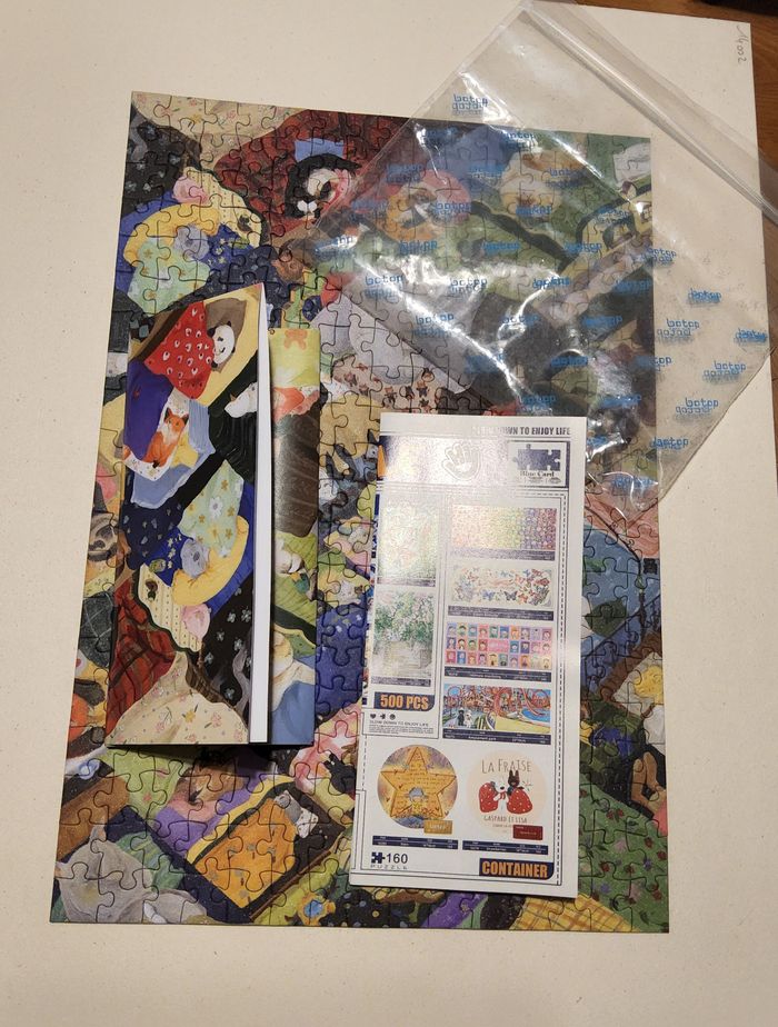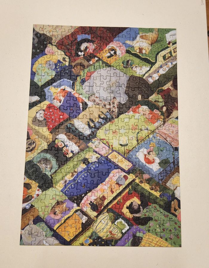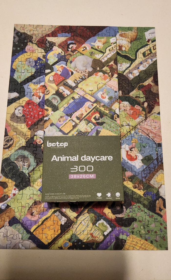 Puzzle 300 pièces « Animal daycare » de la marque Botop. Une marque chinoise d’excellente qualité, difficilement trouvable en Europe. L’entièreté du puzzle ainsi que la boîte sont brillants, comme pailletés. Un poster à taille réelle est inclus. Fait une seule fois, complet et en parfait état.