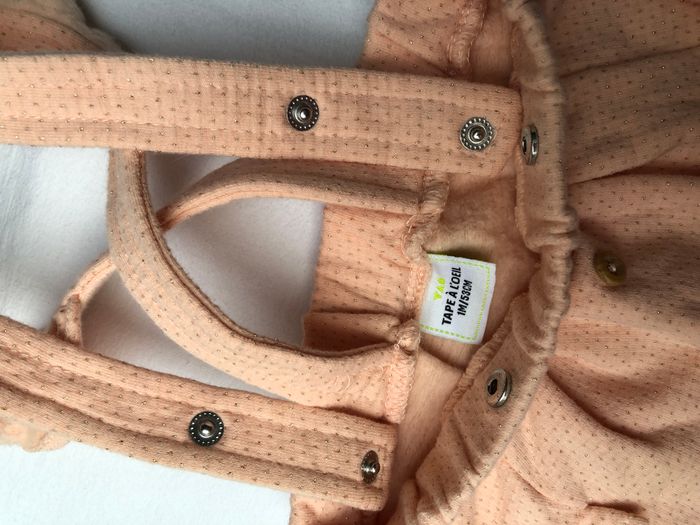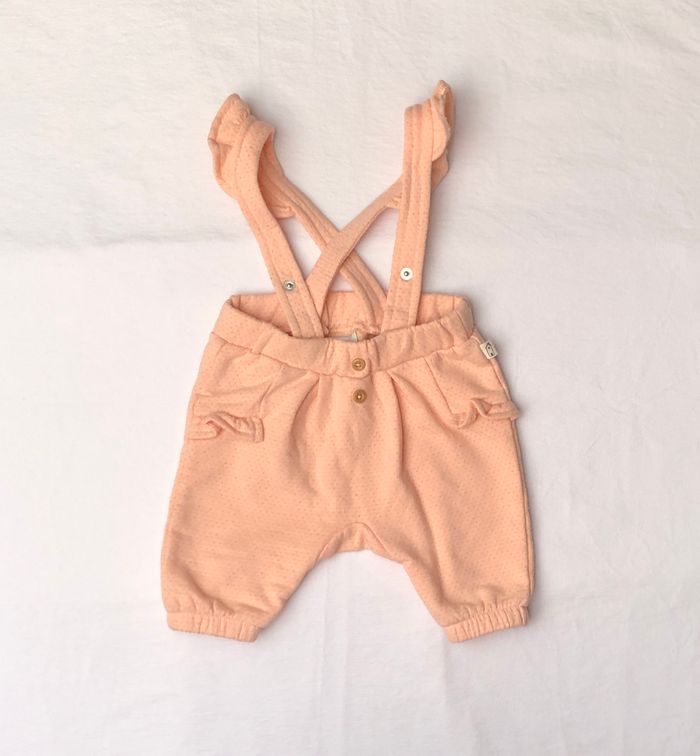 Salopette/ pantalon/ jogging à bretelles Tape à l’œil, Taille 1 mois/ 53 cm, Intérieur tout doux, Longueur des bretelles réglable par pression. De couleur abricot avec des petits points dorés. Petits volants sur les côtés et les bretelles. Boutons décoratifs effet bois sur l’avant. En excellent état, sans trou, ni tache. 🌸 Vous aimez cet article ? N’oubliez pas de visiter le reste de mon dressing en filtrant les tailles.