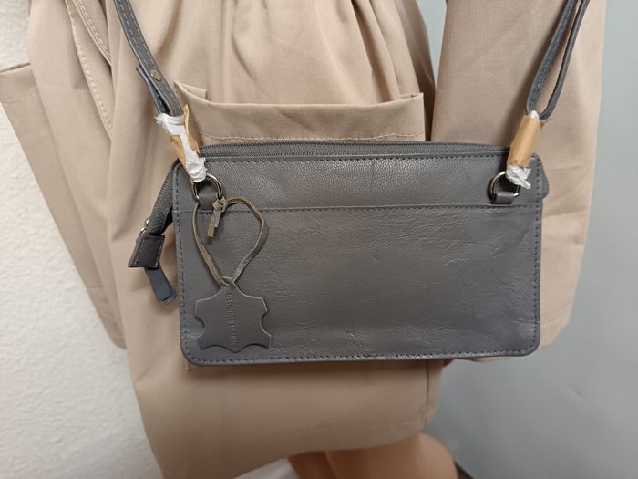 Bonjour, Pochette cuir de chevreau bandoulière neuve. Longueur bandoulière 130 cm plus ou moins. Pochette : 11 cm / 19.3 cm / 3 cm plus ou moins. J' ai pu mettre un porte feuille et un porte monnaie en photo pour vous donner une idée. Couleur gris souris. Made Inde. A bientôt