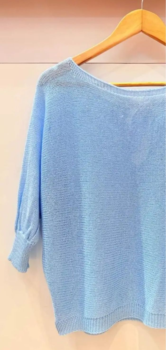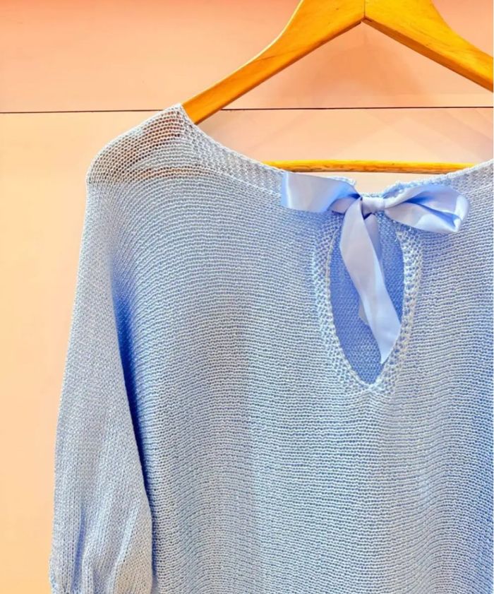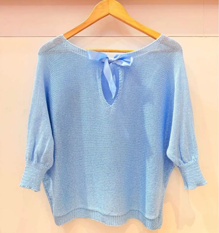 Petit pull léger en maille fine , coloris bleu ciel , petit noeud au dos , manches 3/4 Taille unique qui va du 44 au 48