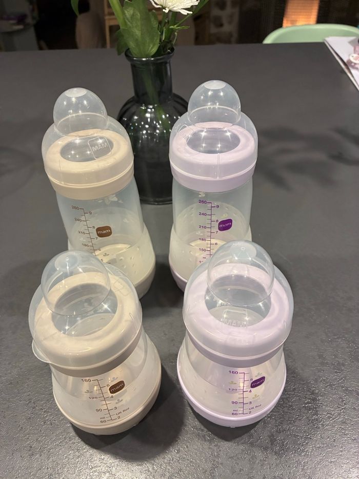 2 biberons de 160 ml + 2 biberons de 260 ml. Très peu servis. Vendus sans tétine, par mesure d’hygiène. 2 valves anti-coliques supplémentaires, encore sous emballage.