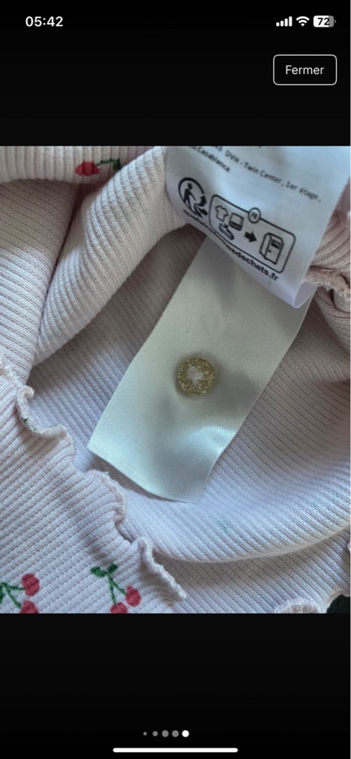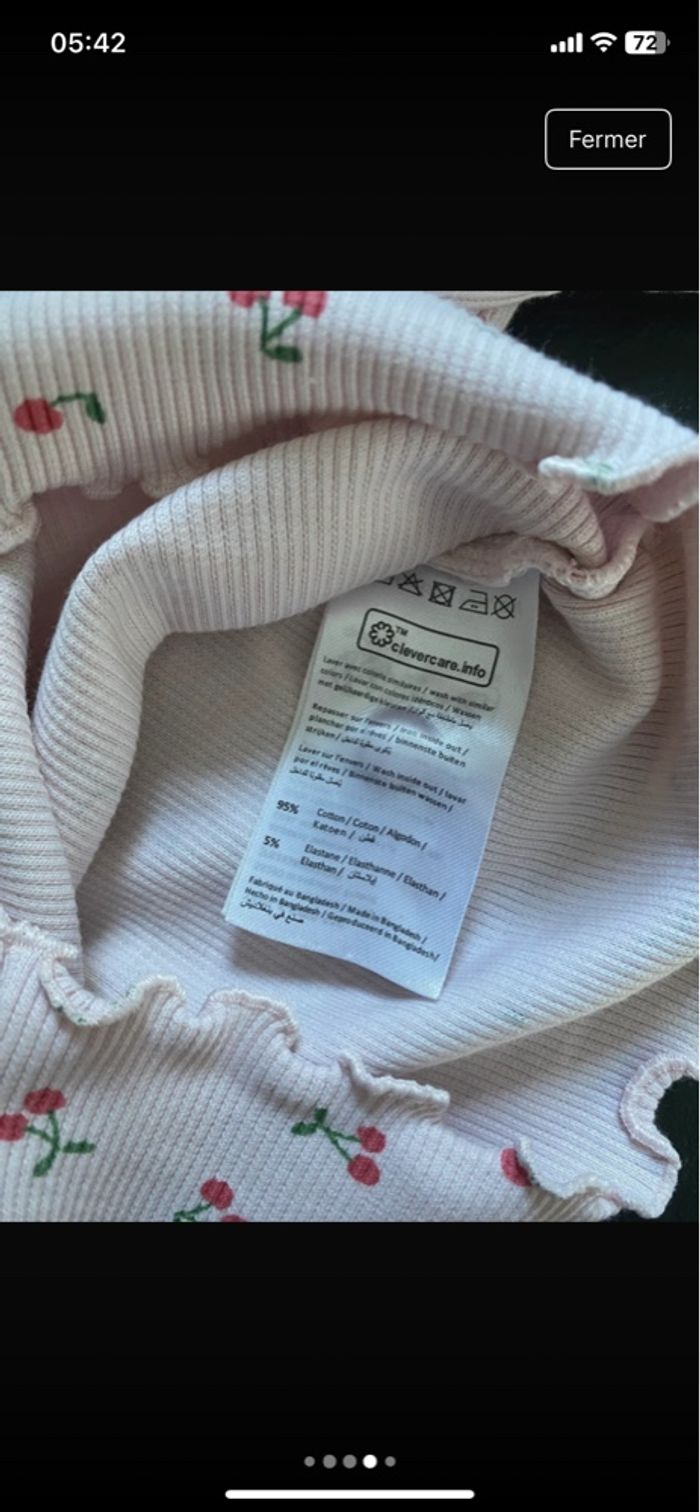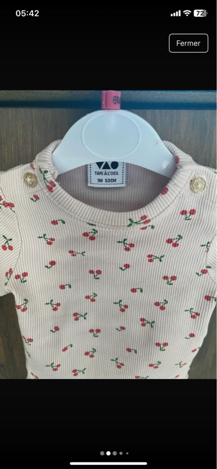 Très bon état – porté seulement 2/3 fois ✨ 💖 Très bon état, peu porté, aucun défaut 👶 📏 Taille : 1 mois 👕 Couleur : Rose 🧼 État : Très bon état (2/3 fois porté seulement) 🎀 Motif : Cerises