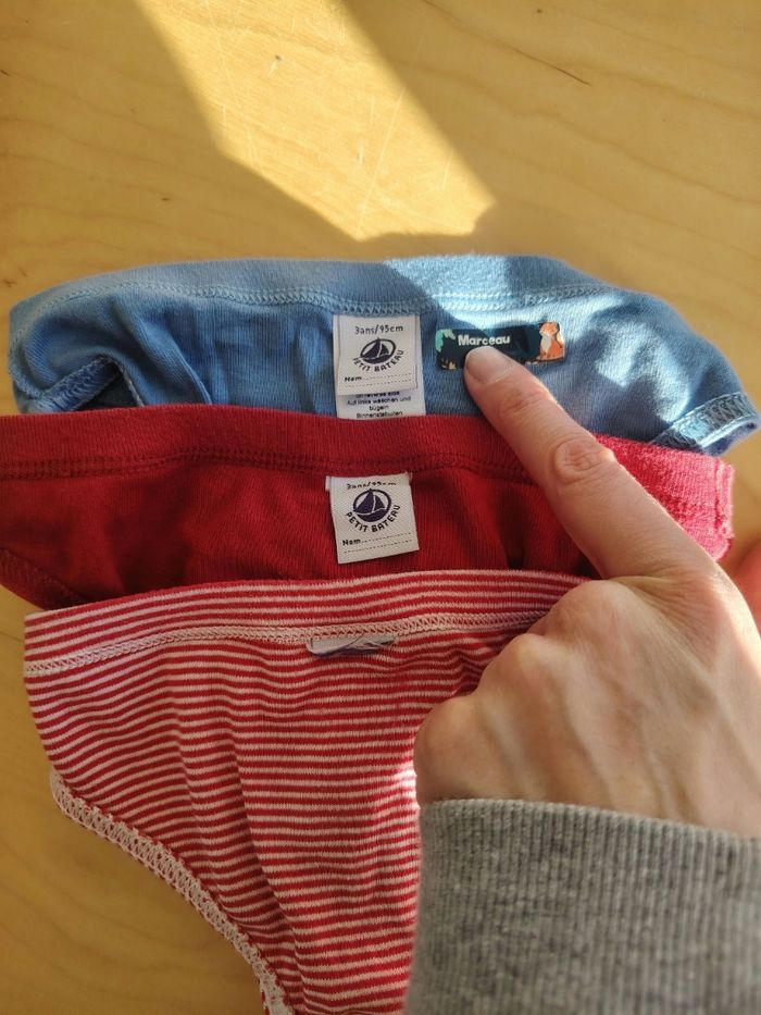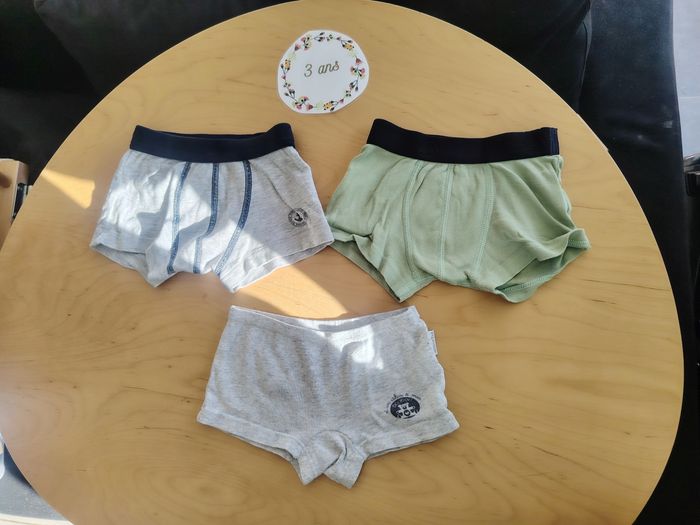 Lot de sous vêtements garçon en taille 3ans petit bateau en très bon état ✅3 slips petit bateau tbe un une étiquette avec le prénom de mon fils ✅2 boxers petit bateau tbe ✅ 1 boxer absorba 2 ans tbe
