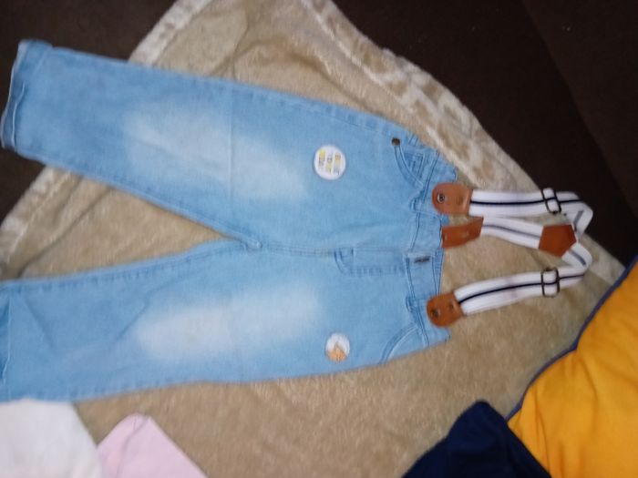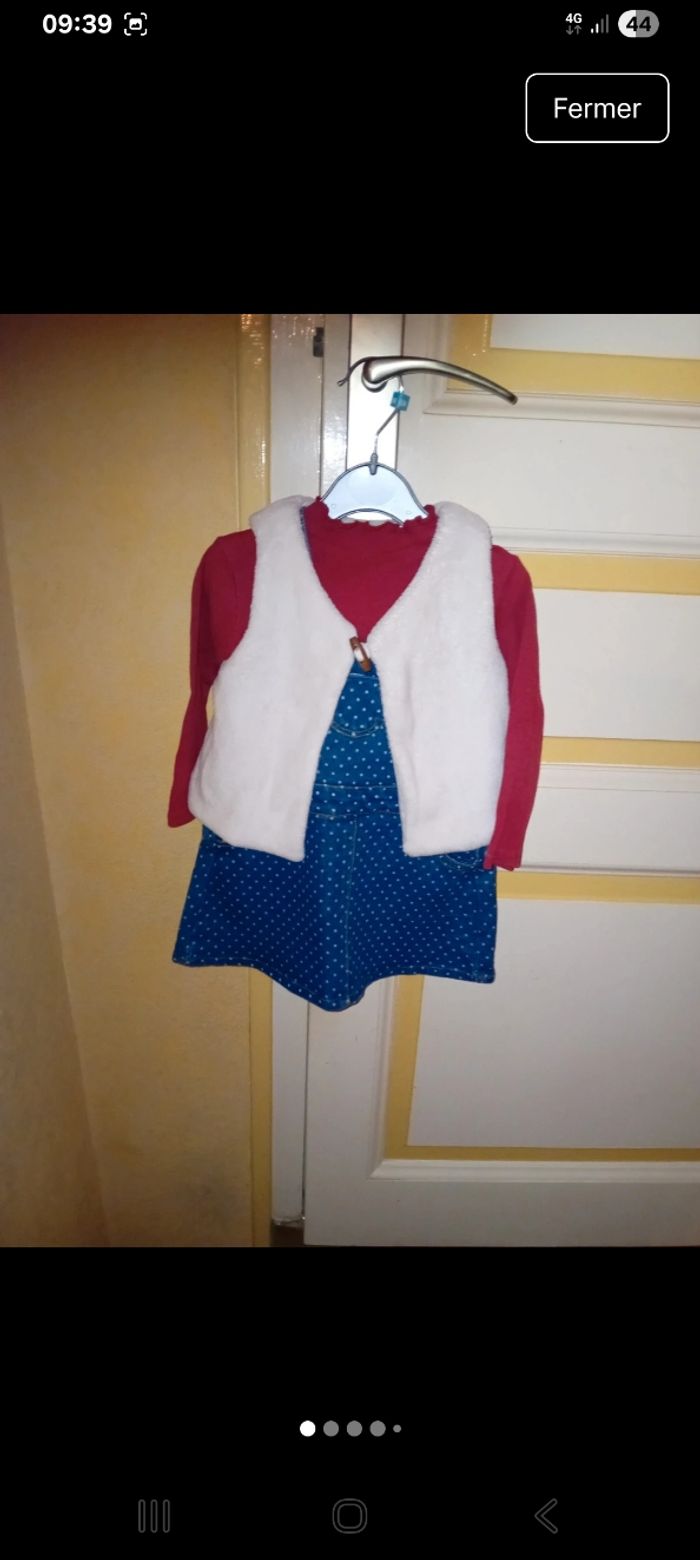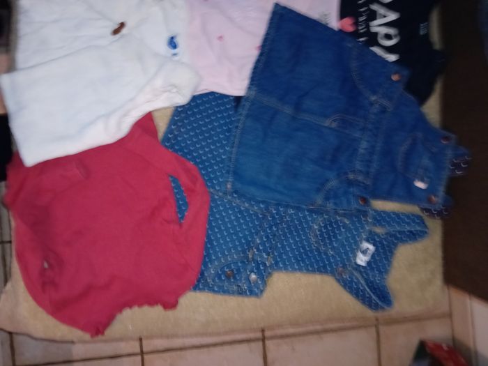 Lot comprenant 1 pantalon salopette ( légèrement tache sur le genoux qui se voit très peu) 1 robe 2 gilets sans manches 1 pyjama 2 robes en jeans 3 Tee-shirt manches courtes Très bon etat