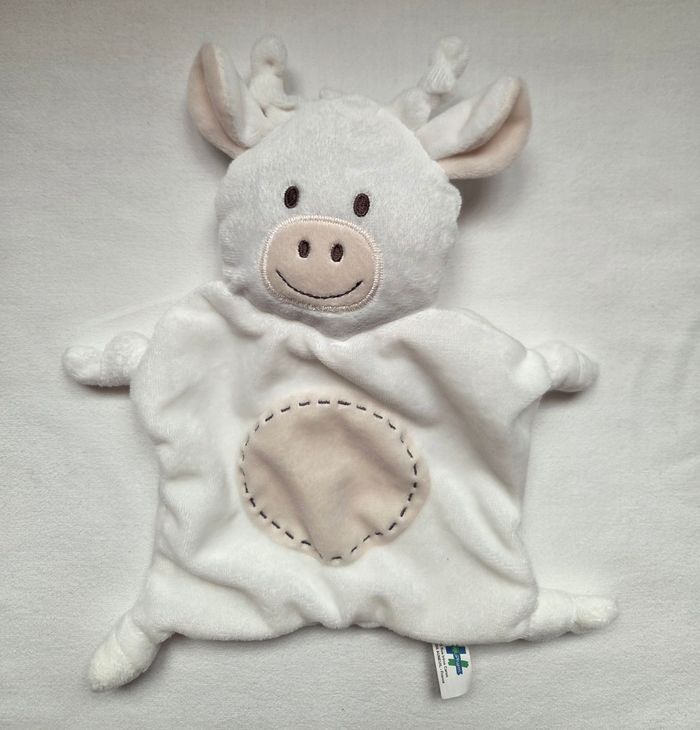 Doudou plat vache / girafe en velours de couleur blanc. Intérieur des oreilles, nez et cercle sur le ventre en velours de couleur beige. Noeud sur chaque coin du doudou.