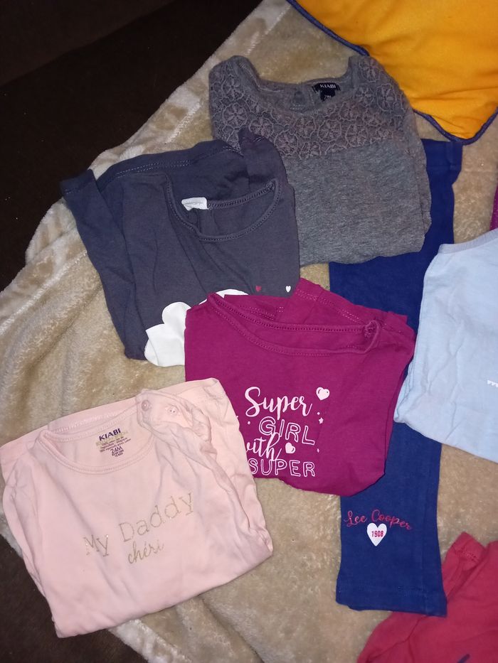 Lot de vêtements taille 24 mois Bon etat Il y a 6 Tee-shirt manches longues 1 debardeur/ maillot de corps 3 bodies 1 legging 1 gilet 2 maillots de coprs marque tex