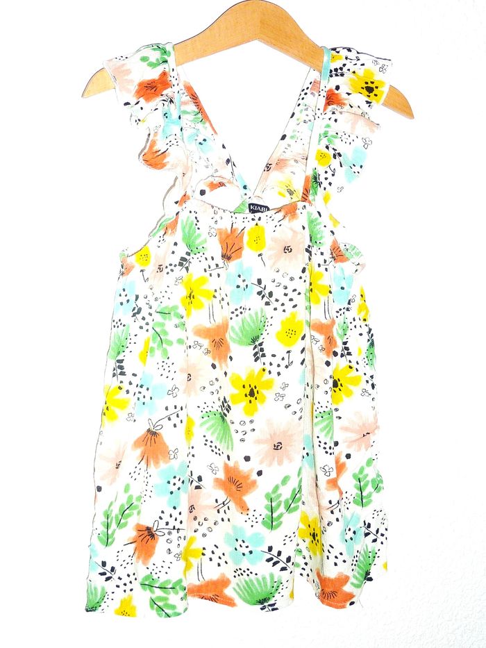 Top aux bretelles volantées, en état excellent, de marque KIABI, imprimé fleuri jaune, corail et menthe sur fond blanc.
