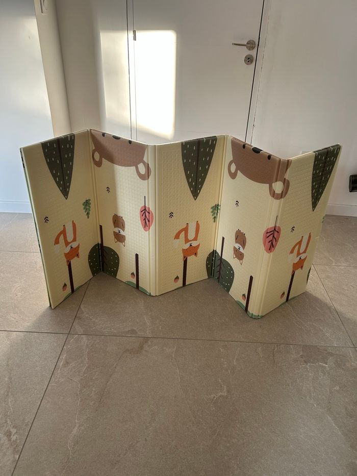 Je vends ce tapis d'éveil évolutif neuf jamais utilisé dans son emballage et sous carton Il mesure 150cmx180cm et 1cm d'épaisseur Idéal pour le développement de la motricité Il est réversible, évolutif, non toxique Nettoyage très simple au savon