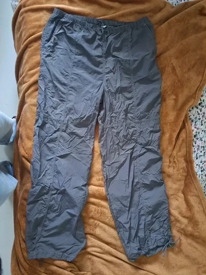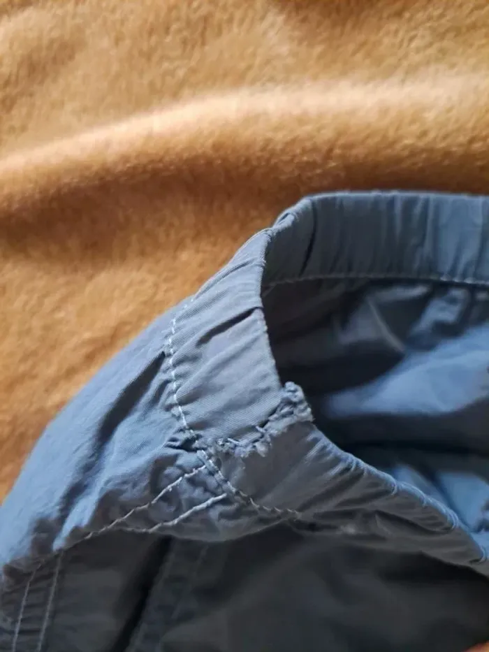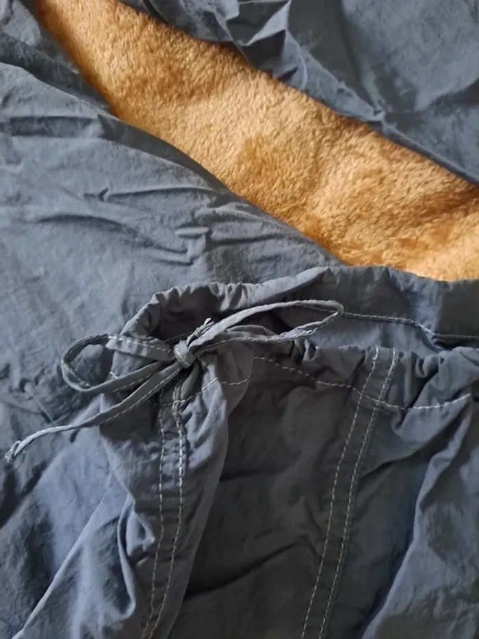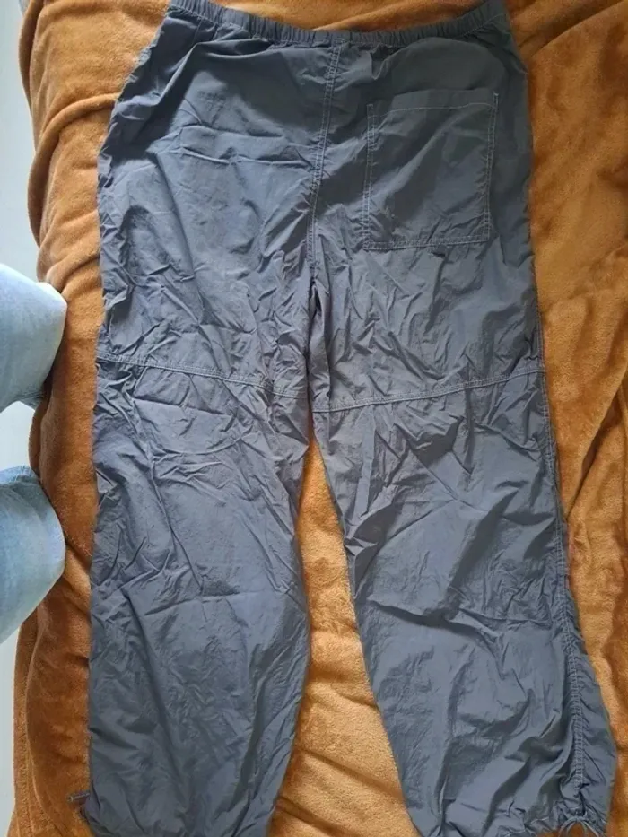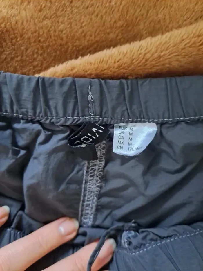 Pantalon cargo gris de chez H&M en taille M. Matière est légère, de type k-way, très agréable à porter. À noter : une petite réparation a été effectuée au niveau de la ceinture (voir photos), mais il reste en bon état général. Taille élastique pour plus de confort.