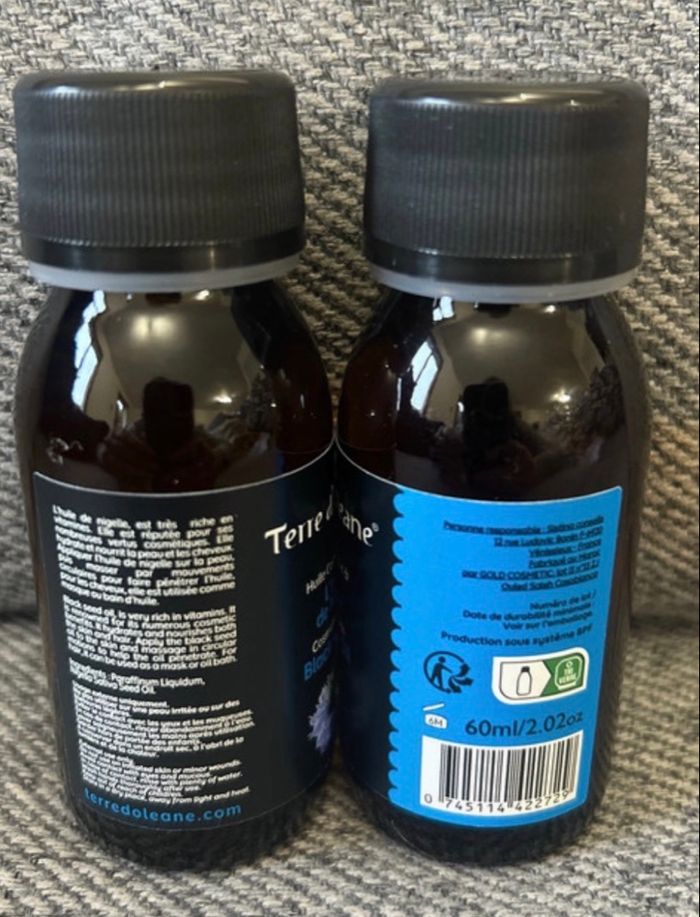 Lot de 2 huiles cosmétiques à l’huile de Nigelle - 60ml Marque : Terre d’Oléane Contenance : 60 ml par flacon Date : 12/07/2026 Neufs jamais ouvert