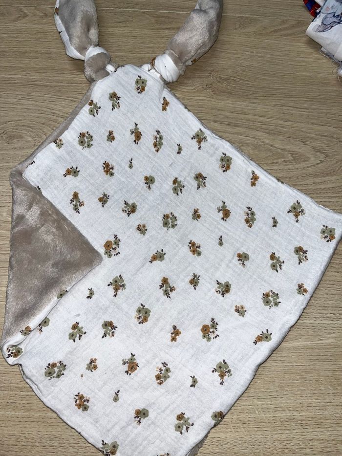 Doudou fait fait Tissu gaze de coton à fleur Tissu super doux beige Avec des oreillers de lapin Possible de rajouter le prénom plus 2 euro Autre tissu sur demande Taille du doudou environ 28x28 cm