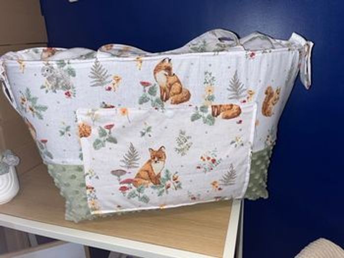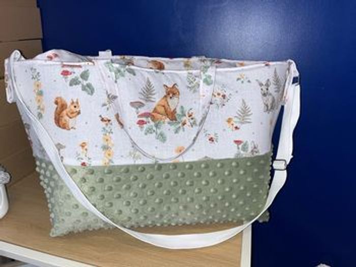 Sac à langer fait main très grand Taille environ 30 cm de hauteur 50 cm de largeur Avec poche extérieur et intérieur Anse réglable sur le coter Attache avec pression sur les coter D’autre model sur demande Possibilité d’avoir le prénom plus 3 euro