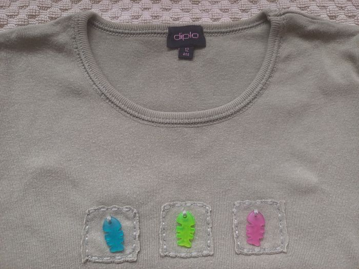 Adorable T-shirt Diplo à manches courtes, au style original et frais ! Joli coloris vert kaki avec 3 poissons colorés (bleu, vert, rose) en relief à l’avant — un détail qui fait toute la différence ✨ ✨ Détails : Taille : 12 ans Couleur : vert kaki Motif : 3 poissons en “plastique” décoratif Matière : 100% coton, doux et confortable En très bon état, parfait pour les journées d’été ou un look casual et fun ! 🌿🐟